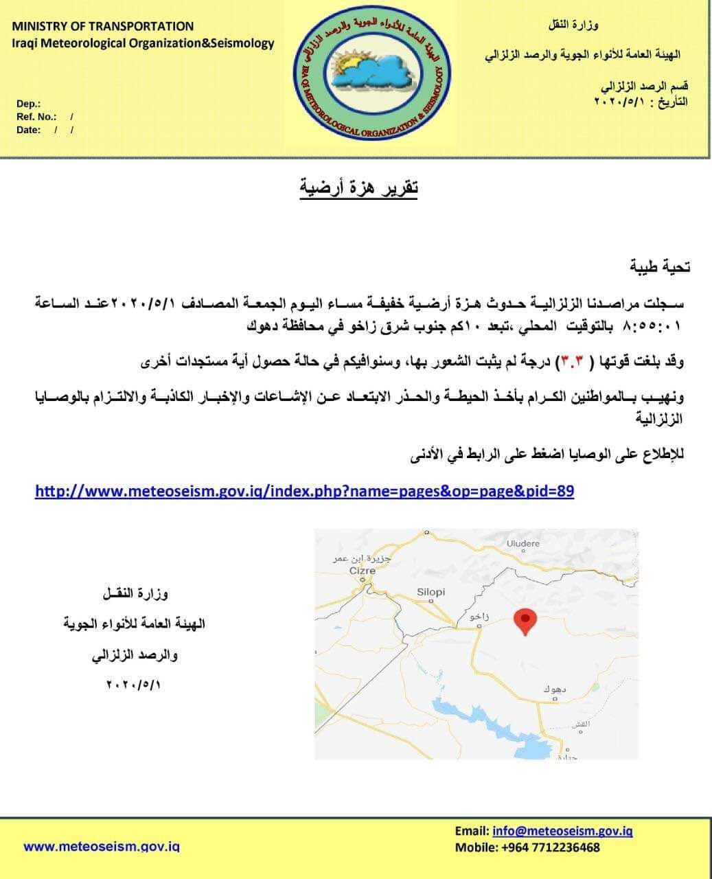 وقالت الوزارة، في بيان تلقته الرشيد، ان “المراصد الزلزالية للهيئة العامة للانواء الجوية سجلت حدوث هزة ارضية مساء اليوم الموافق 1/5/2020 في تمام الساعة (8:55:01) بالتوقيت المحلي لمنطقة جنوب شرق زاخو في محافظة دهوك”.