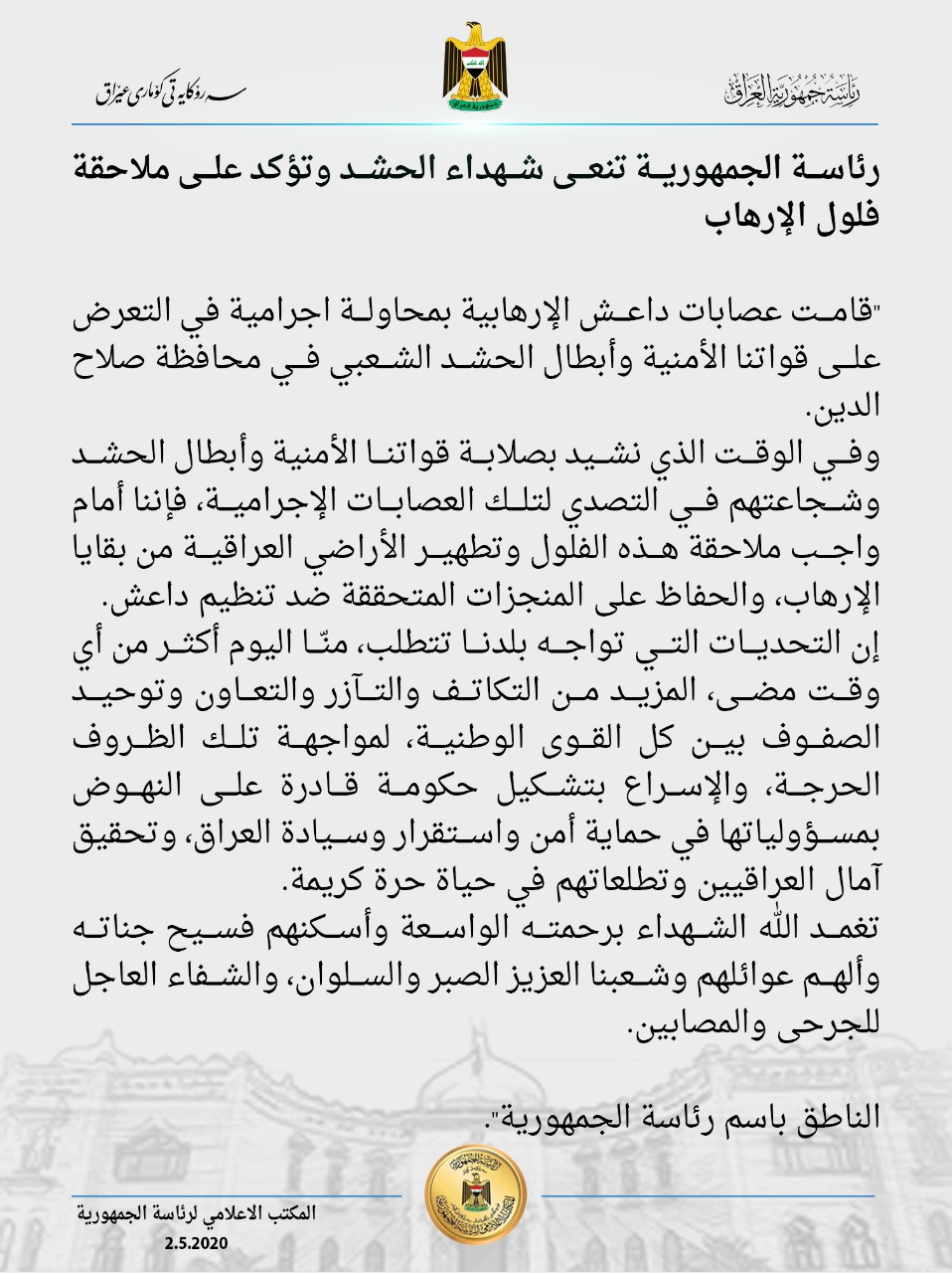 وقالت رئاسة الجمهورية، في نص البيان، “قامت عصابات داعش الإرهابية بمحاولة اجرامية في التعرض على قواتنا الأمنية وأبطال الحشد الشعبي في محافظة صلاح الدين.