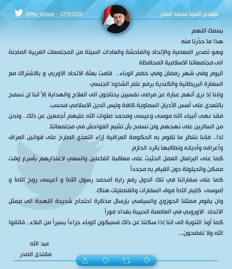 الاخبار العاجلةمحلياتالصدر يغرد بشأن رفع علم المثليين في بغداد قبل 6 سنوات 8 مشاهدات شارك قد يهمك أيضا محليات بابل تقرر تعطيل الدوام الرسمي ليوم غدٍ الخميس بسبب سوء الاحوال الجوية قبل 4 دقائق 4 مشاهدات محليات ذي قار تعلن تعطيل الدوام في المدارس فقط يوم غدٍ الخميس بسبب سوء الأحوال الجوية قبل 18 دقيقة 5 مشاهدات أمن وزارة الدفاع تنفي وقوع انفجارات داخل قاعدة الشهيد محمد علاء الجوية قبل 30 دقيقة 4 مشاهدات محليات قضاء الزبير في البصرة يشهد هطول امطار غزيرة مصحوبة بتساقط حبات البَرَد.. فيديو قبل 40 دقيقة 5 مشاهدات محليات الديوانية تعطل الدوام الرسمي يوم غد الخميس بسبب سوء الأحوال الجوية قبل 56 دقيقة 8 مشاهدات