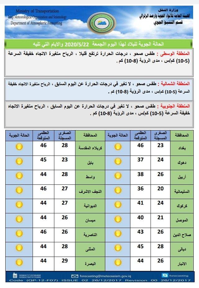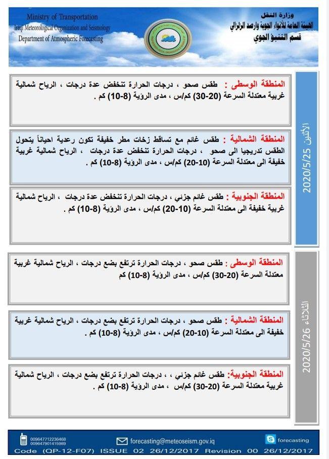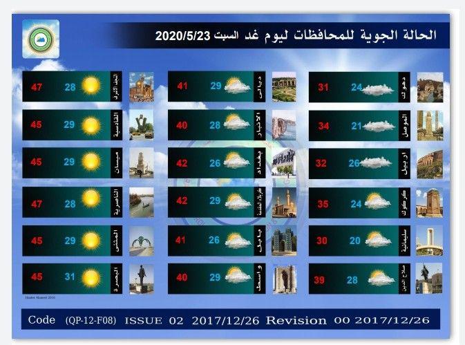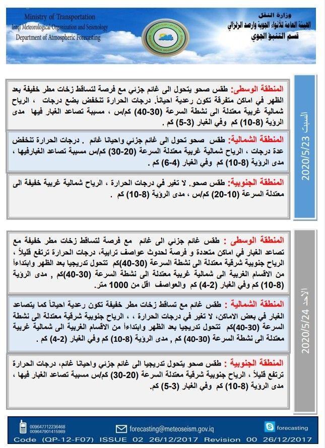 الاخبار العاجلةالحالة الجوية ودرجات الحرارة في العراق لليوم الجمعة والايام المقبلة قبل 6 سنوات 6 مشاهدات شارك قد يهمك أيضا أمن الاعلام الامني: مقتل مجموعة ارهابية بضربة جوية استهدفت مضافتين شمالي راوة قبل 36 دقيقة 6 مشاهدات محليات العراق يدعو مُنظَّمة الشفافيَّة الدوليَّة إلى اعتماد فرع وطني لها في بغداد قبل ساعة واحدة 7 مشاهدات عربي ودولي العدل الأمريكية تحذر من شبكة تطرف على الإنترنت تستغل المراهقين قبل ساعتين 7 مشاهدات أقتصاد وزير الخارجيّة يؤكد حرص العراق على تعميق الشراكة الاستراتيجيّة مع منظمة الأغذية والزراعة (فاو) قبل ساعتين 8 مشاهدات عربي ودولي بريطانيا تفرض عقوبات على داعمين سابقين للأسد قبل ساعتين 6 مشاهدات