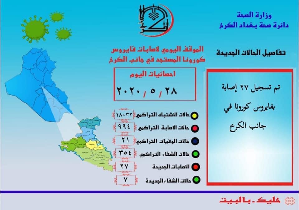 وقال مدير عام الدائرة، جاسب الحجامي، في منشور له على (الفيسبوك)، تابعته الرشيد، ان الموقف الوبائي لدائرة صحة الكرخ مع تفاصيل الحالات المسجلة في مستشفياتها بمرض فيروس كورونا اليوم كالاتي:-