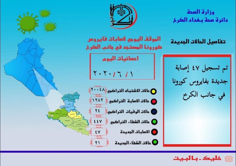 وقال مدير الدائرة، جاسب الحجامي، في منشور له على الفيسبوك، تابعته الرشيد، الموقف الوبائي لدائرة صحة الكرخ مع تفاصيل الحالات المسجلة في مستشفياتها بمرض فيروس كورونا والمعلن عنها من قبل وزارة الصحة اليوم:-