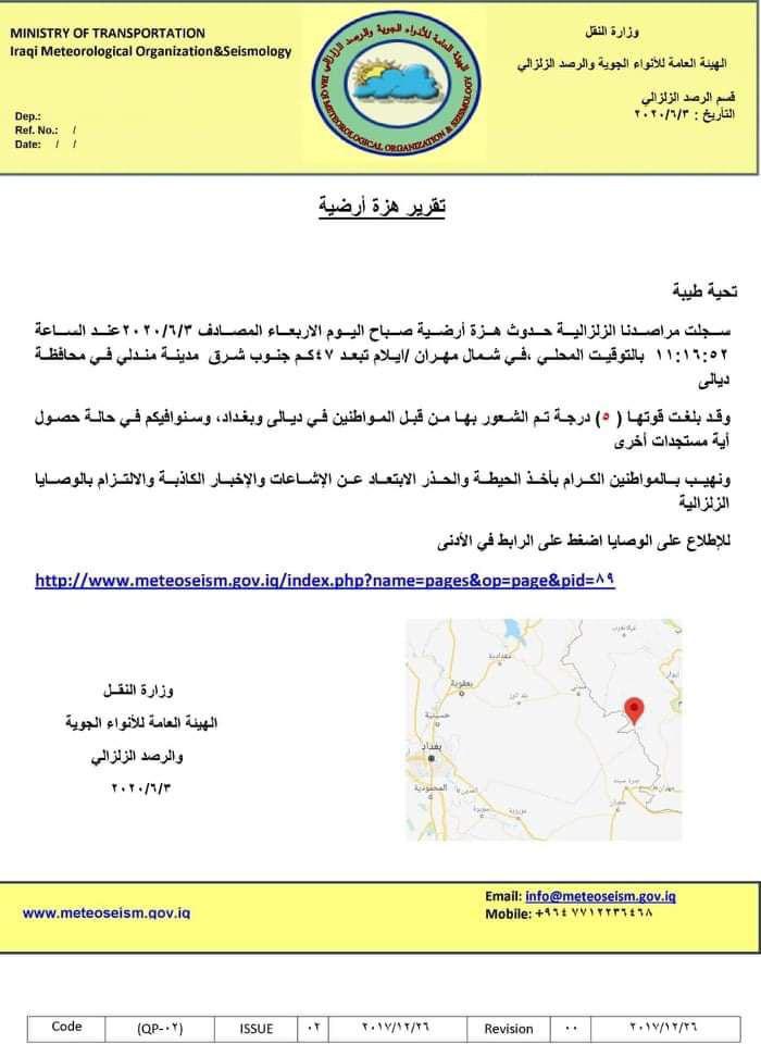اعلنت وزارة النقل، اليوم الاربعاء، تسجيل حدوث هزة أرضية بقوة (5) درجة في شمال مهران ايلام تبعد (47) كم جنوب شرقي محافظة ديالى.