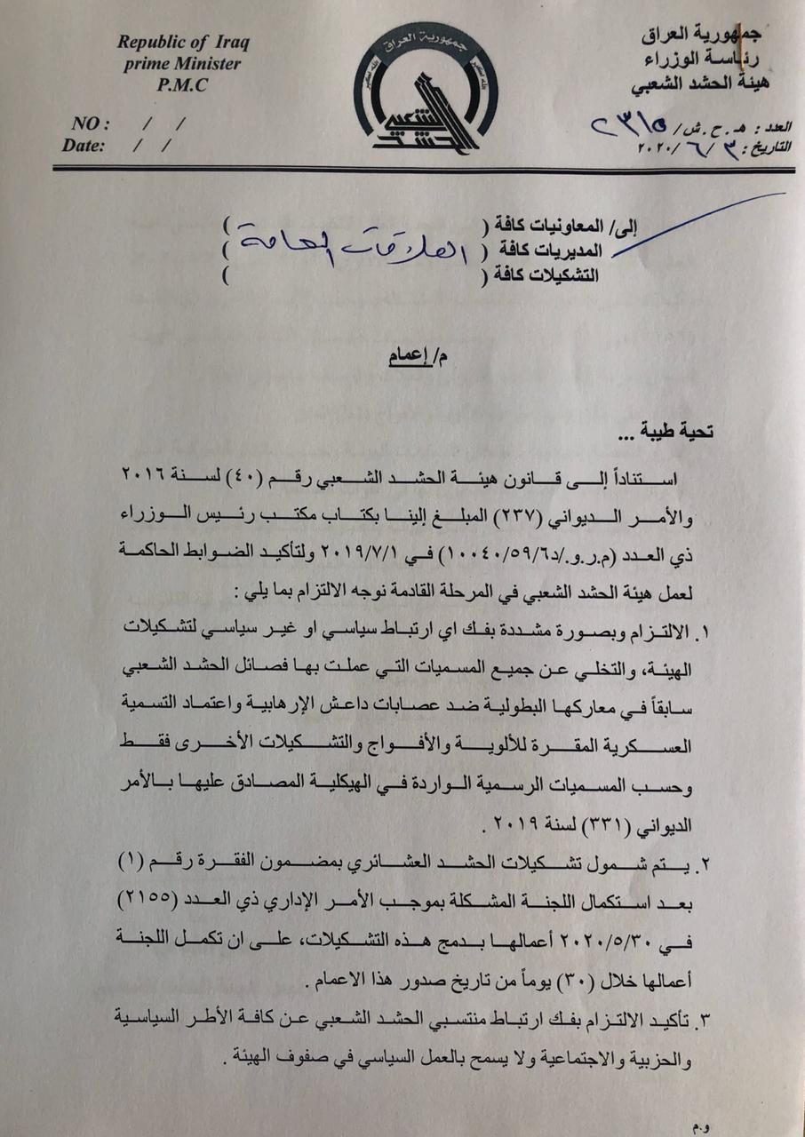 الاخبار العاجلةمحلياتبالوثيقة .. هيئة الحشد الشعبي توجه تشكيلاتها بفك اي ارتباط سياسي واعتماد التسمية العسكرية قبل 6 سنوات 1 مشاهدة شارك قد يهمك أيضا سياسة العراق وباكستان يناقشان الارتقاء بواقع التبادل التجاري والسجناء والعمالة قبل 5 ساعات 9 مشاهدات مع ياسر عامر الفصائل تنزع سلاحها و”النجباء والكتائب” يرفضون!! قبل 5 ساعات 11 مشاهدات سياسة المجلس السياسي الوطني يقرر عقد اجتماع الثلاثاء المقبل لمواصلة النقاشات قبل 6 ساعات 14 مشاهدات سياسة المجلس السياسي الوطني يؤكد الالتزام بالتوقيتات الدستورية لجلسة البرلمان قبل 6 ساعات 14 مشاهدات عربي ودولي السويد.. حادثة تدنيس جديدة للمصحف في مسجد ستوكهولم تؤجج مشاعر المسلمين قبل 6 ساعات 9 مشاهدات