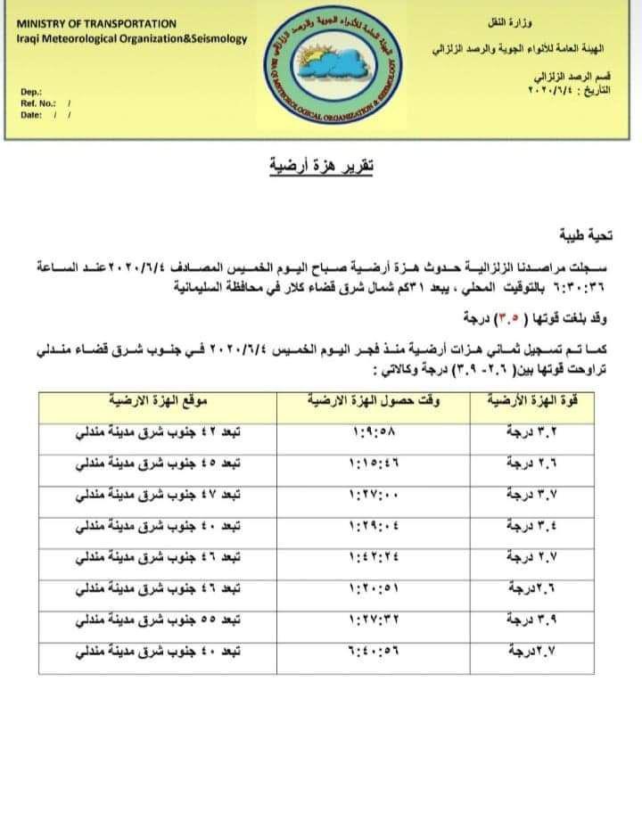 يذكر ان المراصد الزلزالية لوزارة النقل سجلت امس الاربعاء حدوث هزة ارضية في منطقة ايلام في ايران وتم شعور بها في محافظتي العاصمة بغداد وديالى كما سجلت اربعة توابع ارتدادية في المنطقة قرب الحدود العراقية الإيرانية .