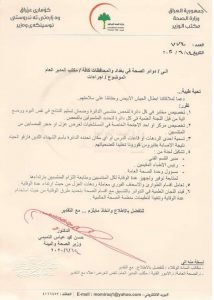 وأظهرت وثيقة صادرة من وزارة الصحة حصلت عليها “الرشيد” عدة إجراءات موجهة لدوائر الصحة في بغداد والمحافظات.