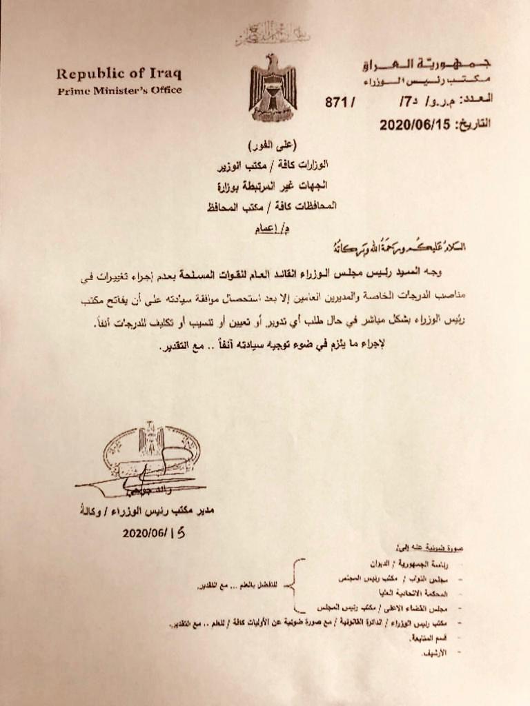 الاخبار العاجلةمحلياتبالوثيقة .. الكاظمي يوجه بعدم اجراء تغييرات بالدرجات الخاصة والمديرين العامين الا بعد استحصال موافقته قبل 6 سنوات 8 مشاهدات شارك قد يهمك أيضا عربي ودولي تحذير مصري قطري تركي عاجل قبل انهيار هدنة غزة قبل 51 دقيقة 10 مشاهدات أمن الداخلية تعلن خلو العراق من أي مصانع للمخدرات أو محاولات لزراعتها قبل ساعتين 5 مشاهدات سياسة السوداني ووفد الديمقراطي يؤكدان أهمية الإسراع بإنجاز الاستحقاقات الدستورية قبل ساعتين 5 مشاهدات محليات الأنواء الجوية: ضباب كثيف وانعدام الرؤية فجر وصباح غدٍ الأربعاء في الوسط والجنوب قبل ساعتين 8 مشاهدات سياسة "الرشيد" تنشر نص قرارات مجلس الوزراء في جلسة اليوم قبل 4 ساعات 19 مشاهدات