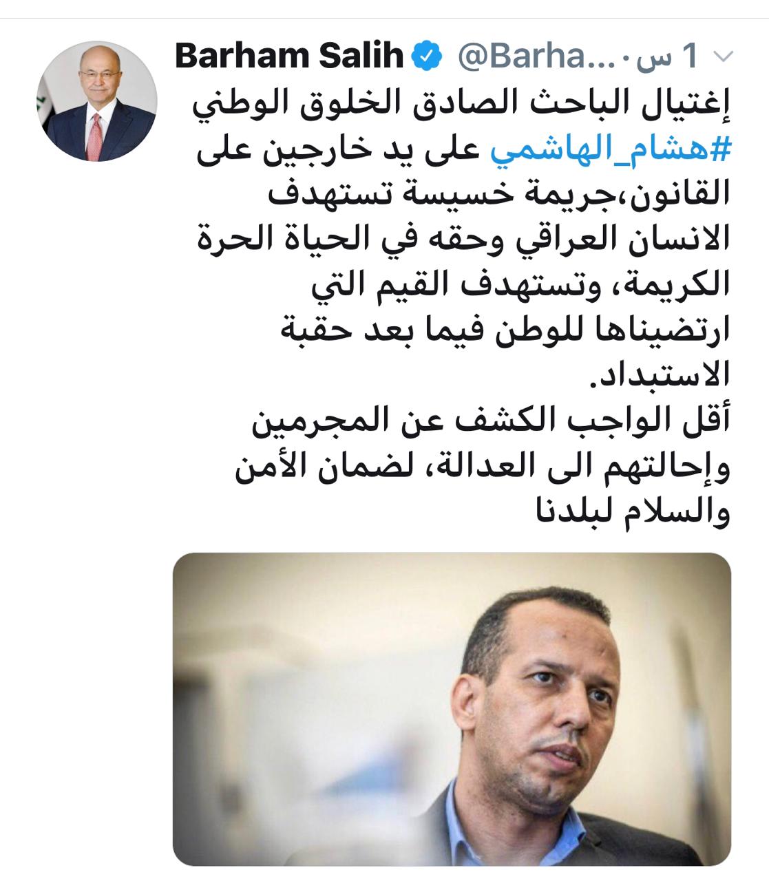 وقال صالح، في تغريدة له على موقع تويتر، تابعتها الرشيد، “إغتيال الباحث الصادق الخلوق الوطني ⁧‫هشام الهاشمي‬⁩ على يد خارجين على القانون، جريمة خسيسة تستهدف الانسان العراقي وحقه في الحياة الحرة الكريمة، وتستهدف القيم التي ارتضيناها للوطن فيما بعد حقبة الاستبداد”.