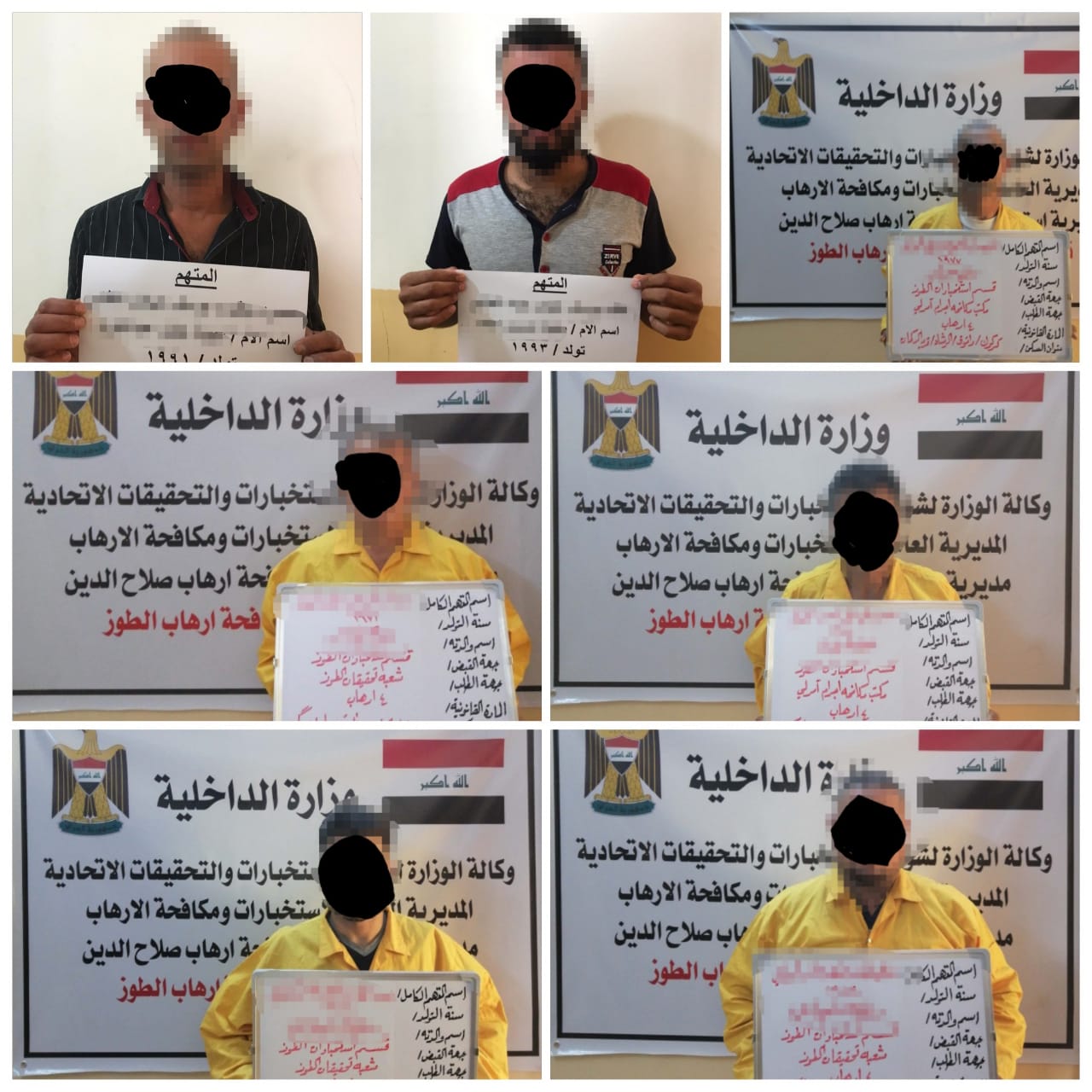 وقالت الوكالة، في بيان تلقته الرشيد، انه “وفقاً لمعلومات استخباراتية دقيقة، ألقت مفارز وكالة الاستخبارات في وزارة الداخلية القبض على 7 إرهابيين بمناطق متفرقة من قضاء الطوز بمحافظة صلاح الدين مطلوبين وفق أحكام المادة 4 إرهاب لانتمائهم لعصابات داعش الإرهابية”.