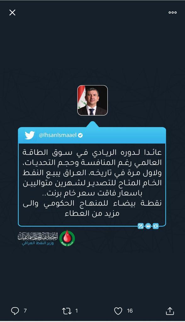 الاخبار العاجلةمحلياتوزير النفط: العراق يبيع النفط الخام لشهرين متواليين بأسعار فاقت سعر خام برنت قبل 5 سنوات 14 مشاهدات شارك قد يهمك أيضا سياسة البطريركية الكلدانية توضح بشأن ما تداولته بعض المواقع والصفحات من تصريحات لويس ساكو قبل 4 ساعات 16 مشاهدات عربي ودولي الداخلية السورية: اعتقال زعيم تنظيم داعش بدمشق في عملية أمنية بالتعاون مع التحالف الدولي قبل 5 ساعات 12 مشاهدات سياسة السيد الصدر: لا مكان للتطبيع ولا لشرعنته في العراق قبل 5 ساعات 10 مشاهدات عربي ودولي الحرس الثوري الإيراني يوقف سفينة محملة بـ4 ملايين لتر من الوقود المهرب في مياه الخليج قبل 5 ساعات 11 مشاهدات عربي ودولي الجيش الأردني يشن غارات استهدفت شبكات تهريب ومزارع مخدرات بريف السويداء قبل 6 ساعات 10 مشاهدات