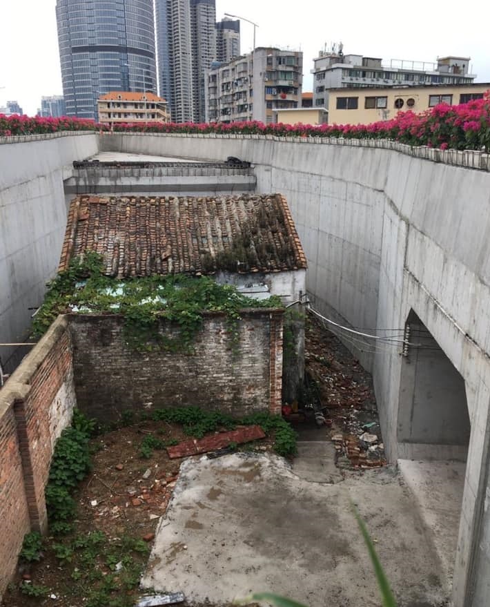 امرأة صينية رفضت ترك بيتها القديم لكي يُبنى مكانه جسراً للسيارات، وذلك لعدم رضاها عن التعويضات المقدّمة لها من سُلطات المنطقة وهي: شقّتان و 1.3 مليون يوان، مطالبةً بأربع شققٍ سكنية بمكانٍ جيد و 2 مليون يوان، الأمر الذي رفضته السلطات فبنت الجسر حول المنزل وقد أغلقت عليه من كل جانب