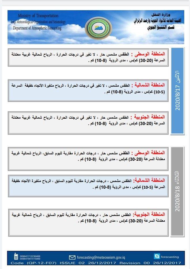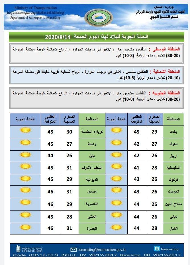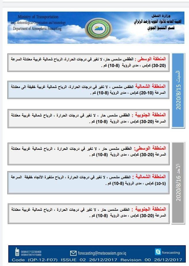 الاخبار العاجلةمحلياتالحالة الجوية ودرجات الحرارة في العراق لليوم الجمعة والايام المقبلة قبل 5 سنوات 4 مشاهدات شارك الطقس قد يهمك أيضا أمن الداخلية تعلن تفكيك 176 شبكة دولية للمخدرات وتؤكد نجاح التعاون الإقليمي قبل دقيقتان 2 مشاهدات محليات الانواء الجوية: العراق يتأثر بمنخفض شبه قطبي يتسبب بأمطار وتدني درجات الحرارة قبل ساعة واحدة 9 مشاهدات محليات الكهرباء: الإنتاج الحالي يصل لـ17 ألف ميغاواط قبل ساعتين 9 مشاهدات محليات الموارد: خطة لإنشاء 50 سداً لحصاد المياه غالبيتها في نينوى والأنبار قبل ساعتين 10 مشاهدات عربي ودولي الصحة اللبنانية: شهيد في غارة إسرائيلية على بلدة مجدل سلم جنوبي البلاد قبل ساعتين 11 مشاهدات