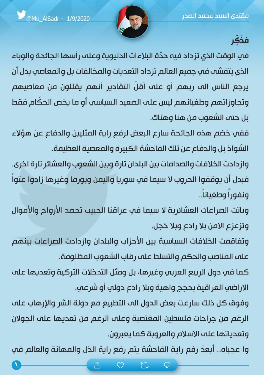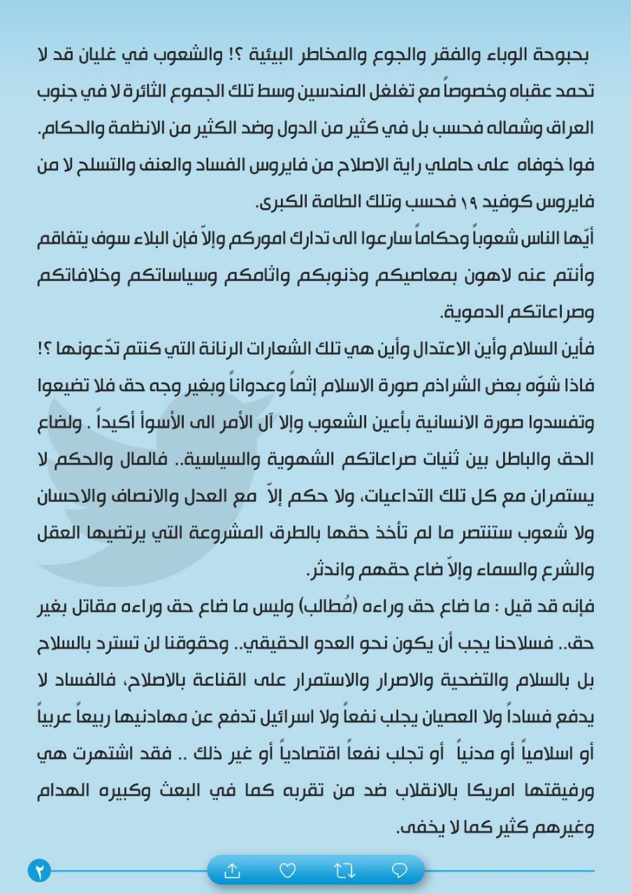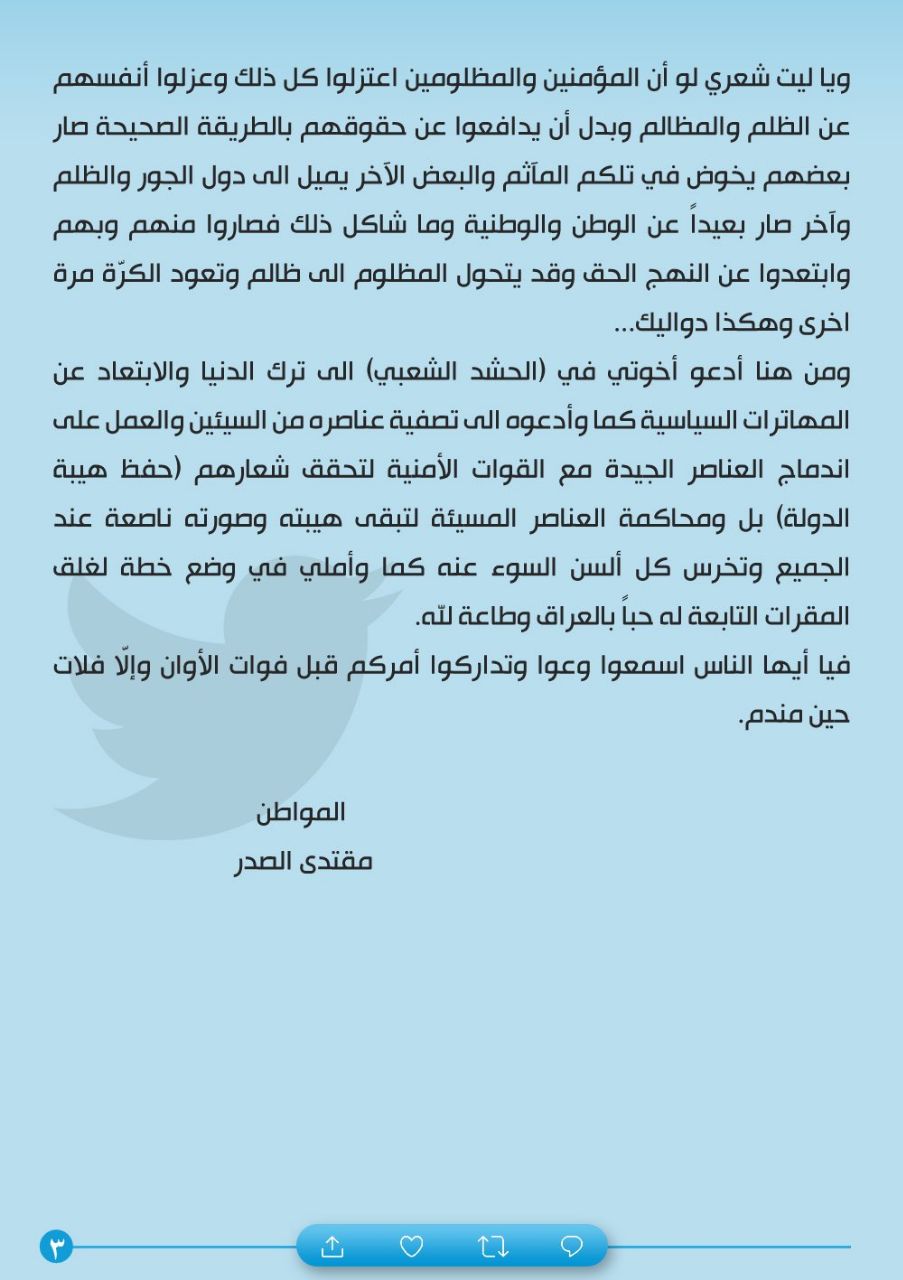 الاخبار العاجلةمحلياتالصدر يدعو الى تصفية الحشد من السيئين ودمج العناصر الجيدة بالقوات الامنية قبل 5 سنوات 3 مشاهدات شارك قد يهمك أيضا عربي ودولي خبير عسكري أمريكي يحذر من احتمال مواجهة مباشرة بين روسيا وحلف "الناتو" قبل 5 ساعات 10 مشاهدات أمن الداخلية تعلن تفكيك 176 شبكة دولية للمخدرات وتؤكد نجاح التعاون الإقليمي قبل 6 ساعات 8 مشاهدات محليات الانواء الجوية: العراق يتأثر بمنخفض شبه قطبي يتسبب بأمطار وتدني درجات الحرارة قبل 7 ساعات 20 مشاهدات محليات الكهرباء: الإنتاج الحالي يصل لـ17 ألف ميغاواط قبل 8 ساعات 12 مشاهدات محليات الموارد: خطة لإنشاء 50 سداً لحصاد المياه غالبيتها في نينوى والأنبار قبل 8 ساعات 14 مشاهدات