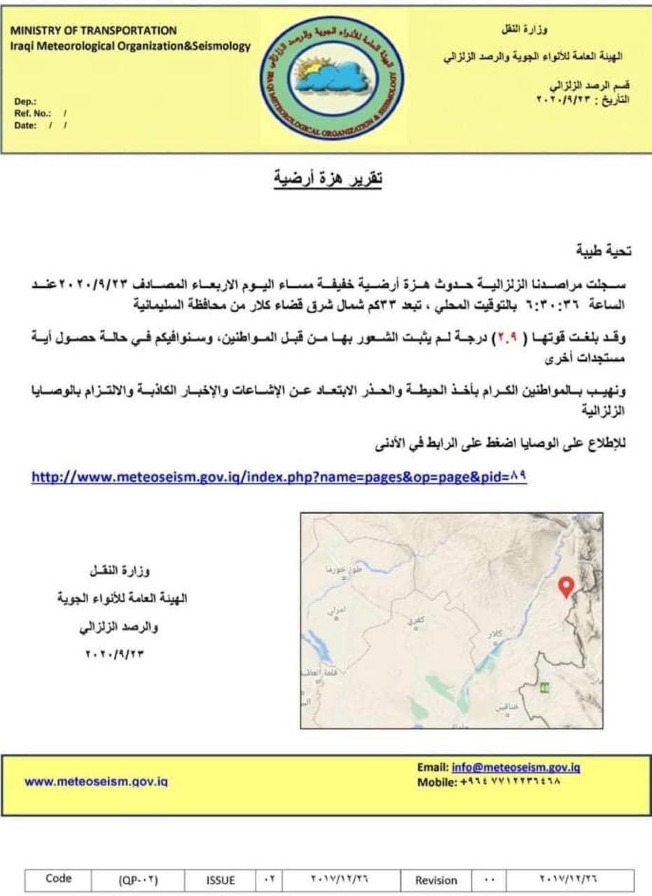 وقالت الوزارة، في بيان تلقته الرشيد، ان “مراصد الهيئة العامة للانواء الجوية والرصد الزلزالي سجلت حدوث هزة أرضية خفيفة مساء اليوم الموافق 23/ ايلول / 2020 في شمال شرق قضاء كلار عند الساعة (6:30:36) بالتوقيت المحلي لمحافظة السليمانية”.