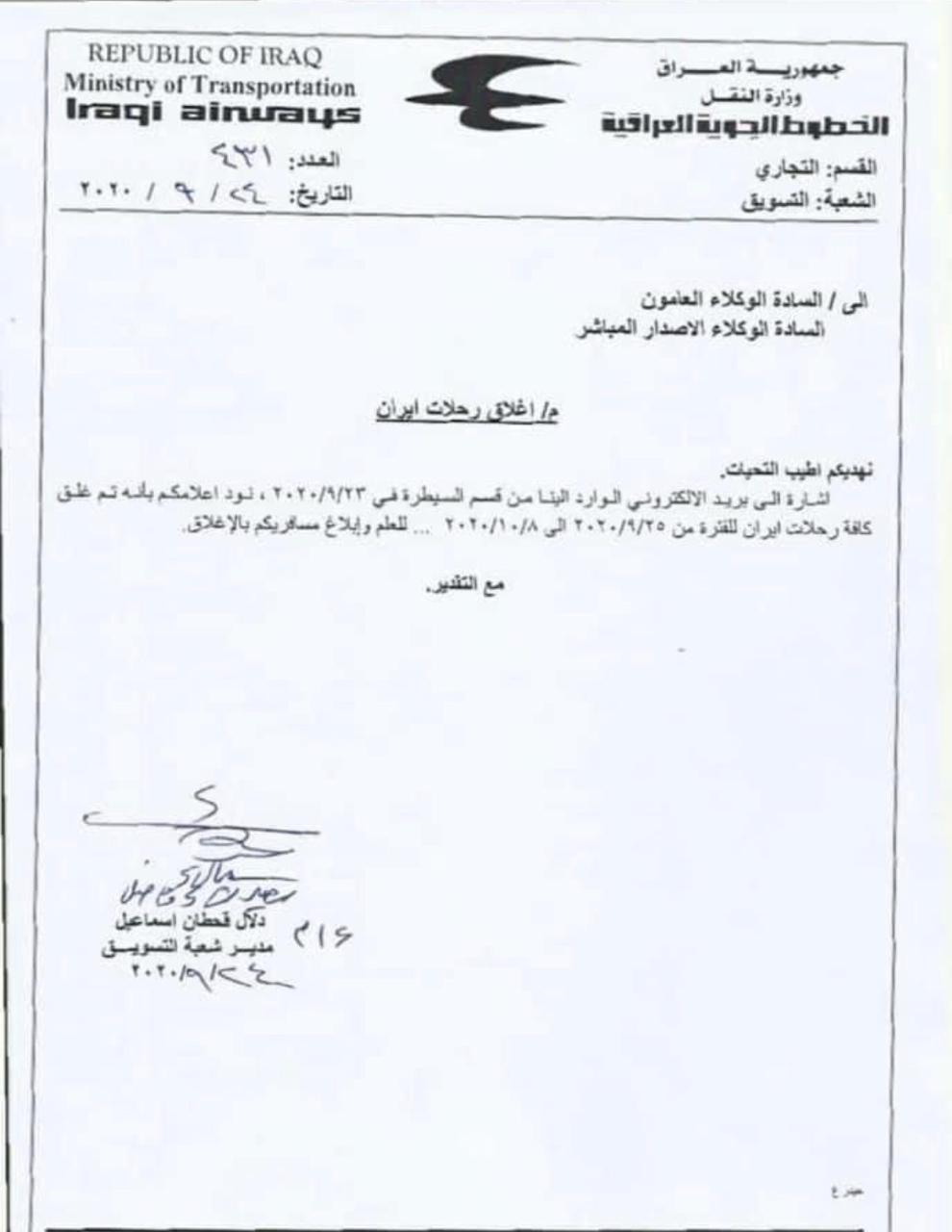 الاخبار العاجلةمحلياتبالوثيقة .. الخطوط الجوية العراقية تغلق كافة الرحلات الى ايران لغاية 8/10/2020 قبل 5 سنوات 5 مشاهدات شارك قد يهمك أيضا سياسة المجلس السياسي الوطني يعلن ترشيح القيادي في "تقدم" هيبت الحلبوسي لمنصب رئيس البرلمان قبل ساعتين 17 مشاهدات محليات الأنواء الجوية: منخفض قطبي جديد تبدأ تأثيراته يوم غد الإثنين قبل ساعتين 9 مشاهدات عربي ودولي ترامب: روسيا وأوكرانيا تريدان إنهاء الحرب قبل ساعتين 5 مشاهدات سياسة ترامب: سيكون هناك اتفاق أمني بشأن أوكرانيا قبل ساعتين 6 مشاهدات سياسة قبل جلسة اداء اليمين الدستورية.. محافظ كركوك يتنازل عن مقعده في البرلمان للمرشح الاحتياط قبل ساعتين 7 مشاهدات