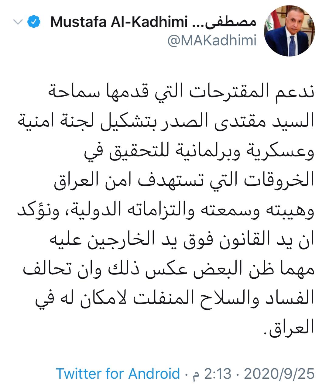 الاخبار العاجلةمحلياتالكاظمي: ندعم مقترحات الصدر بتشكيل لجنة للتحقيق في الخروقات التي تستهدف امن العراق قبل 5 سنوات 3 مشاهدات شارك قد يهمك أيضا سياسة المجلس السياسي الوطني يعلن ترشيح القيادي في "تقدم" هيبت الحلبوسي لمنصب رئيس البرلمان قبل 5 ساعات 23 مشاهدات محليات الأنواء الجوية: منخفض قطبي جديد تبدأ تأثيراته يوم غد الإثنين قبل 5 ساعات 19 مشاهدات عربي ودولي ترامب: روسيا وأوكرانيا تريدان إنهاء الحرب قبل 5 ساعات 8 مشاهدات سياسة ترامب: سيكون هناك اتفاق أمني بشأن أوكرانيا قبل 5 ساعات 8 مشاهدات سياسة قبل جلسة اداء اليمين الدستورية.. محافظ كركوك يتنازل عن مقعده في البرلمان للمرشح الاحتياط قبل 5 ساعات 10 مشاهدات