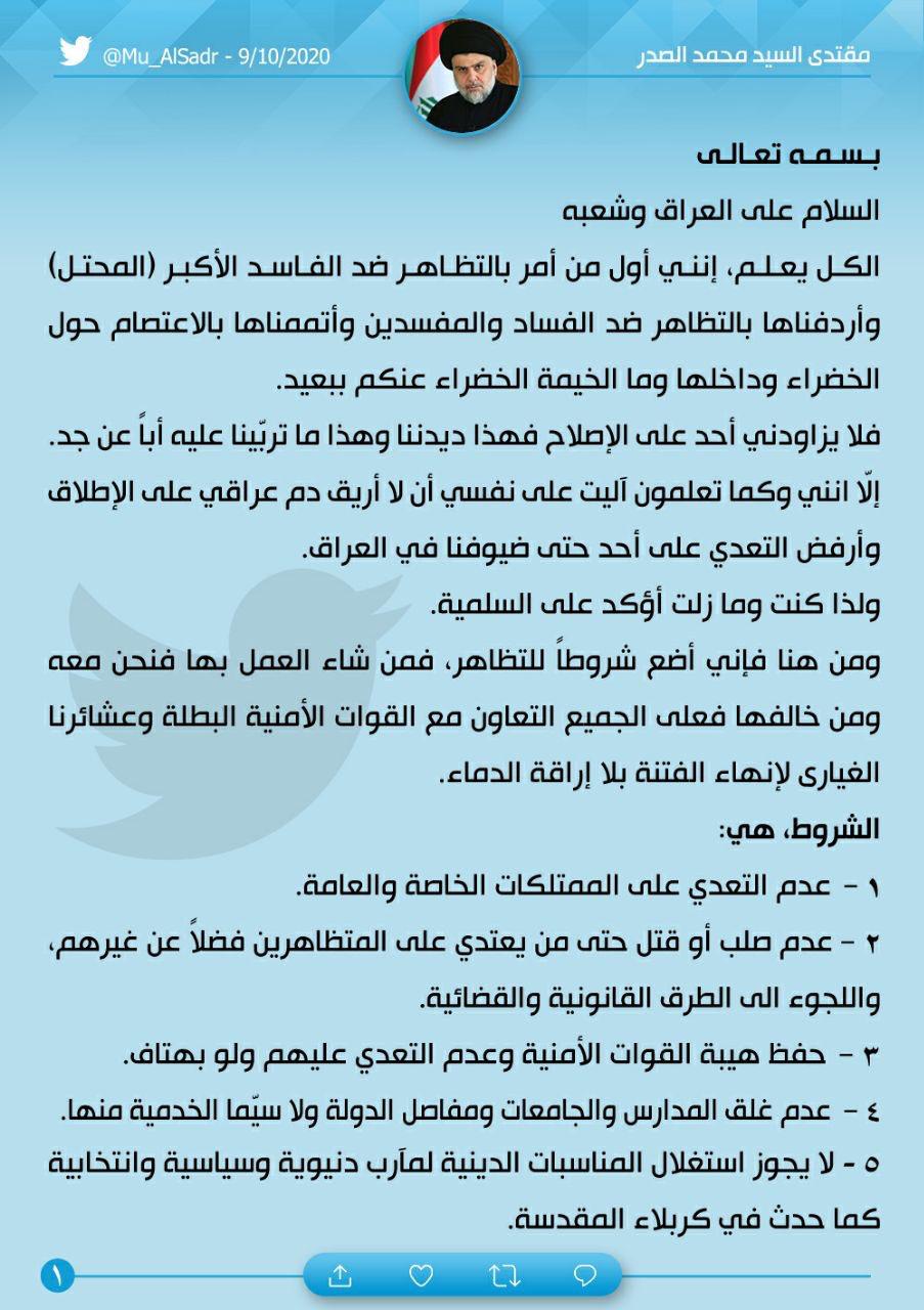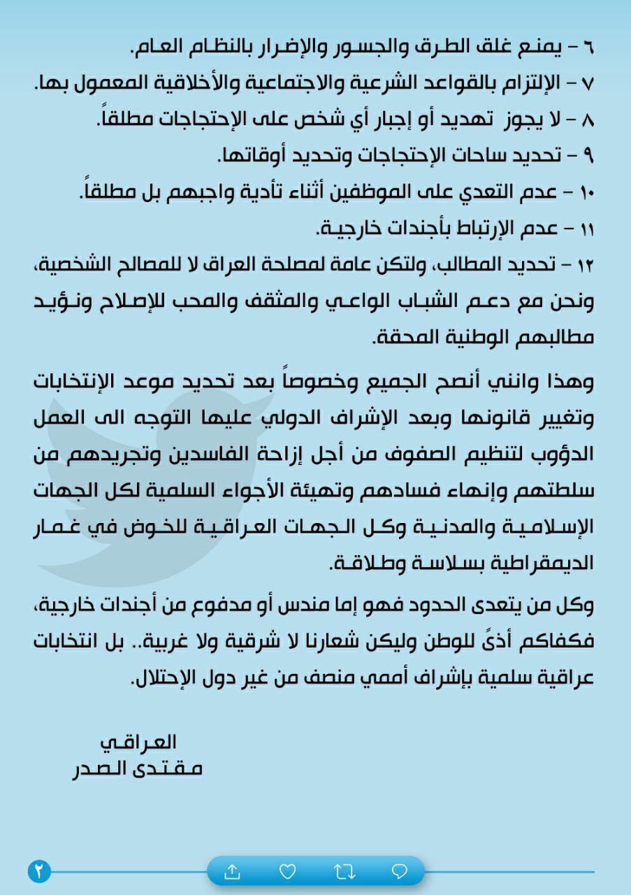 الاخبار العاجلةمحلياتالصدر يضع اثنى عشر شرطاً للتظاهر قبل 5 سنوات 5 مشاهدات شارك قد يهمك أيضا سياسة انتهاء عملية التصويت لانتخاب النائب الثاني لرئيس مجلس النواب قبل 4 دقائق 2 مشاهدات سياسة مجلس الوزراء يخول وزير الخارجية صلاحية التوقيع على مذكرة إغلاق بعثة الامم المتحدة بالعراق قبل 15 دقيقة 4 مشاهدات أقتصاد مجلس الوزراء يفرض رسماً جمركياً إضافياً بمقدار 30% على منتج اللبن الرائب والسائل المستورد قبل 16 دقيقة 5 مشاهدات أقتصاد مجلس الوزراء يقرر فرض رسم جمركي إضافي بمقدار 40% من وحدة قياس منتج غاز الاوكسجين قبل 17 دقيقة 3 مشاهدات سياسة "الرشيد" تنشر نص قرارات مجلس الوزراء في جلسة اليوم قبل 21 دقيقة 2 مشاهدات