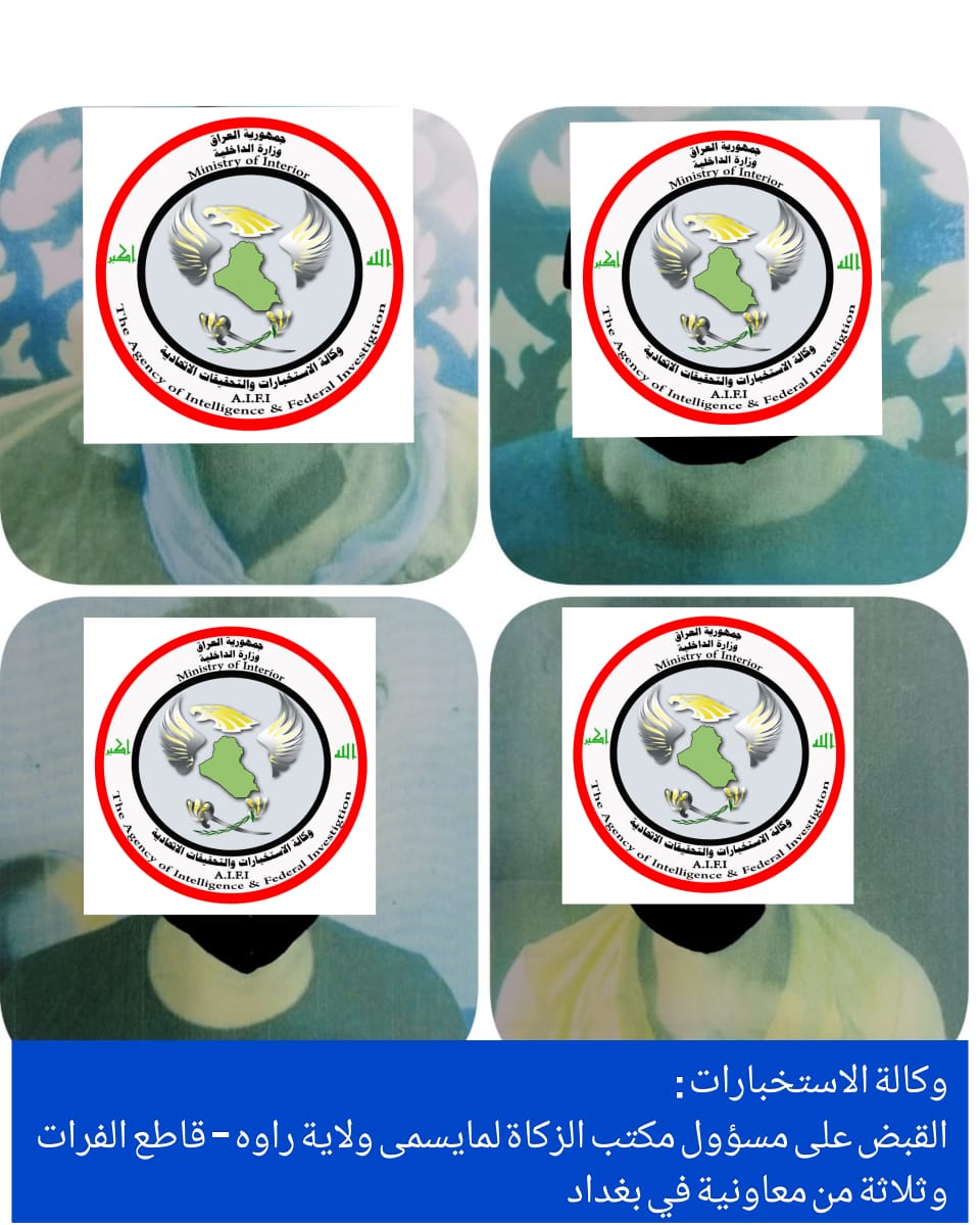 اعلنت وكالة الاستخبارات، اليوم السبت، القبض على مسؤول مكتب الزكاة لما يسمى ولاية راوه – قاطع الفرات و 3 من معاونية في بغداد.