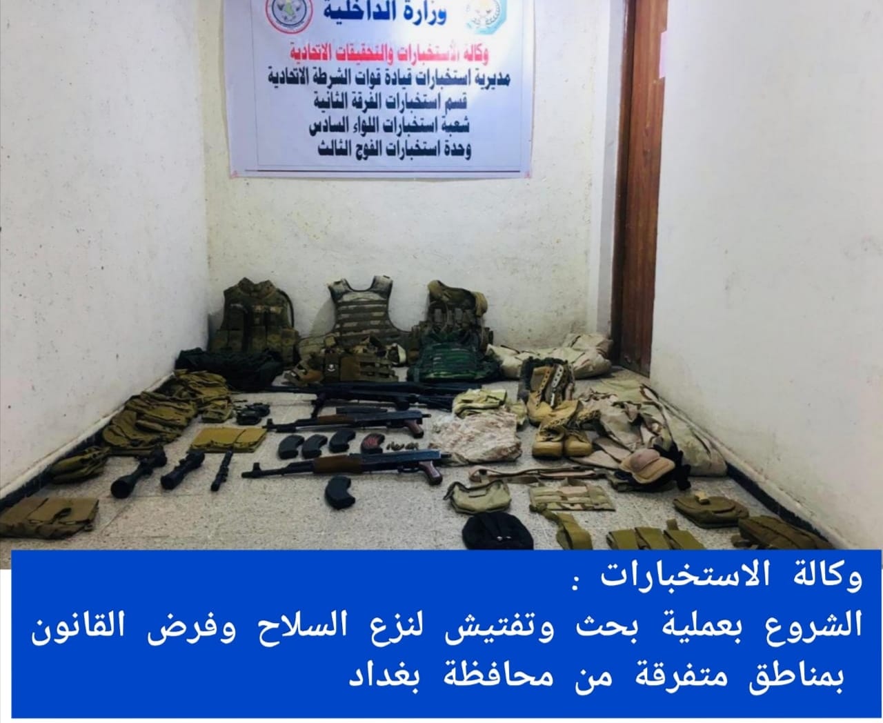 اعلنت وكالة الاستخبارات، اليوم الثلاثاء، الشروع بعملية بحث وتفتيش لنزع السلاح وفرض القانون بمناطق متفرقة من بغداد.