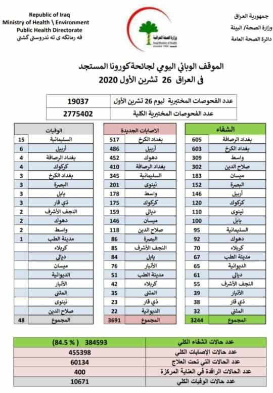 الاخبار العاجلةمحلياتالصحة تعلن تسجيل 48 وفاة بكورونا و 3244 حالة شفاء من الفيروس قبل 5 سنوات 2 مشاهدات شارك قد يهمك أيضا محليات مصرع واصابة 3 اشخاص بانقلاب مركبة في حي الجهاد ببغداد قبل 26 دقيقة 3 مشاهدات عربي ودولي إصابة 15 شخصا بانفجار في متجر للخمور في مدينة الناصرة بإسرائيل قبل ساعة واحدة 8 مشاهدات محليات التربية: احراق مدرسة شرقي بغداد واعتقال المتسببين في الحادث قبل ساعتين 18 مشاهدات محليات الصحة تعلن تسجيل 300 إصابة بالألعاب النارية في ليلة رأس السنة قبل 3 ساعات 15 مشاهدات أمن الأمن الوطني يعلن تنفيذ أكثر من 1200 أمر قبض بقضايا إرهابية وجرائم مخدرات قبل 3 ساعات 11 مشاهدات