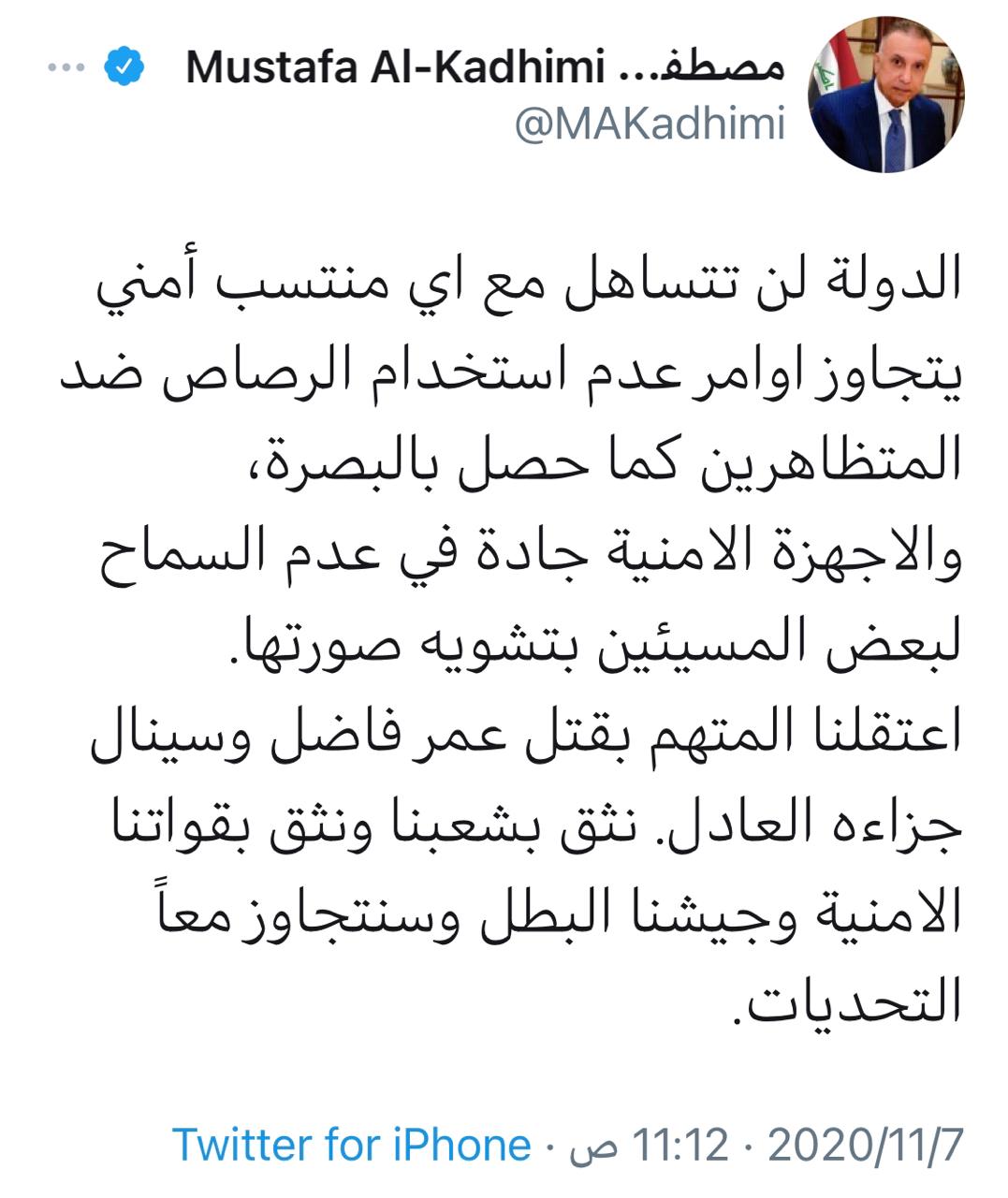 الاخبار العاجلةمحلياتالكاظمي: الدولة لن تتساهل مع اي منتسب أمني يتجاوز اوامر عدم استخدام الرصاص ضد المتظاهرين قبل 5 سنوات 2 مشاهدات شارك قد يهمك أيضا الاخبار العاجلة المبعوث الأممي السابق أخضر الإبراهيمي: الهدف من أفغانستان كان العراق قبل 8 ساعات 26 مشاهدات محليات الأنواء: العراق يتأثر بموجة قطبية تتسبب بانخفاض درجات الحرارة إلى الصفر المئوي أو أدنى خلال الأيام القادمة قبل 9 ساعات 23 مشاهدات محليات العراق يعزي سويسرا بضحايا حادث منتجع كرانس-مونتانا للتزلج قبل 9 ساعات 32 مشاهدات محليات مصرع وإصابة 11 شخصاً بحادثي سير في ديالى والمثنى قبل 9 ساعات 11 مشاهدات أمن مقتل شخص بإطلاق نار وسط مدينة العمارة قبل 9 ساعات 33 مشاهدات