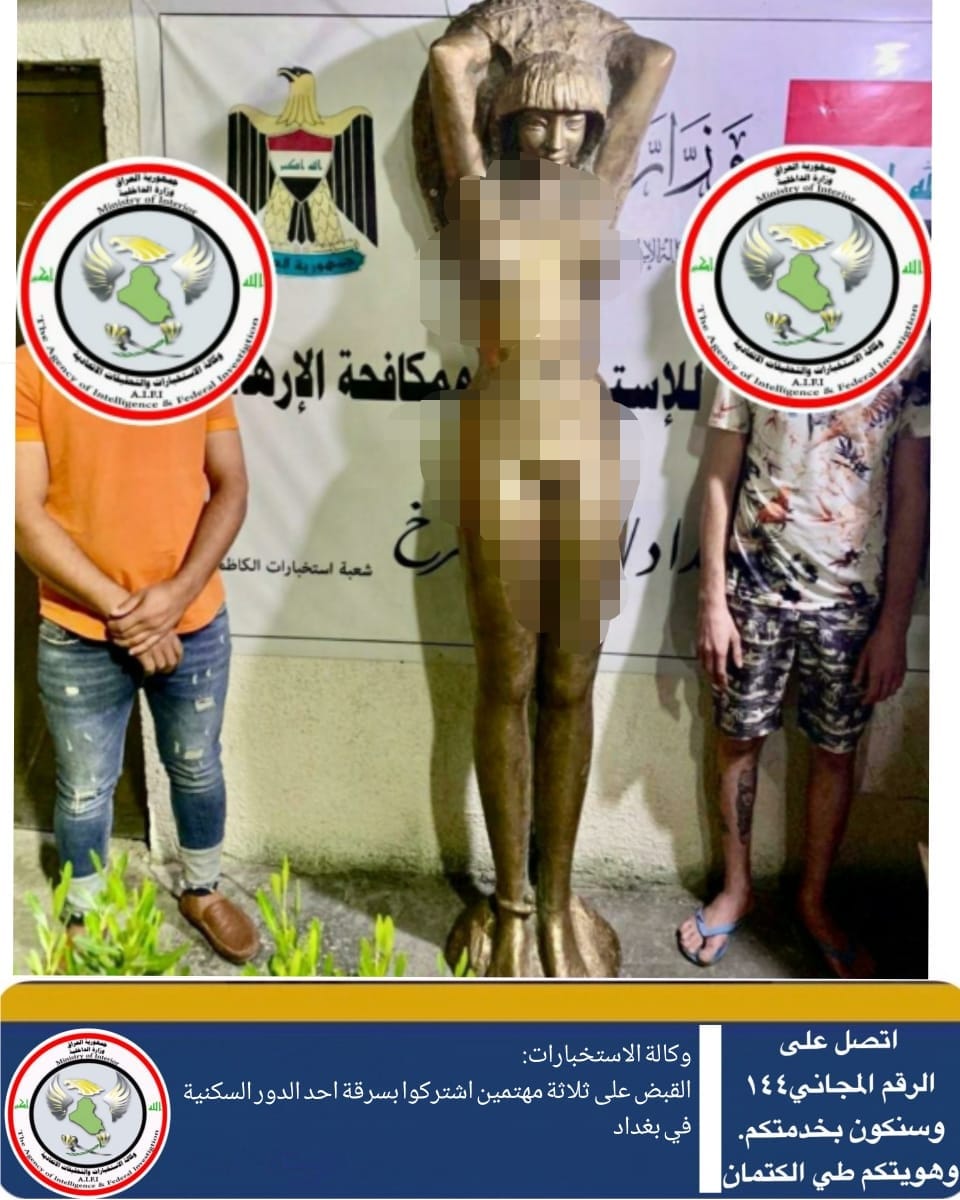 واضافت، انه “بدلالة المتهم تم القبض على المتهمين الاخرين وبالجرم المشهود وبحوزتهم المواد المسروقة عبارة عن تمثال نحاسي تبلغ قيمته(٥٠ الف دولار أمريكي ) ومواد أخرى بقيمة( ٦ الاف دولار امريكي)”.