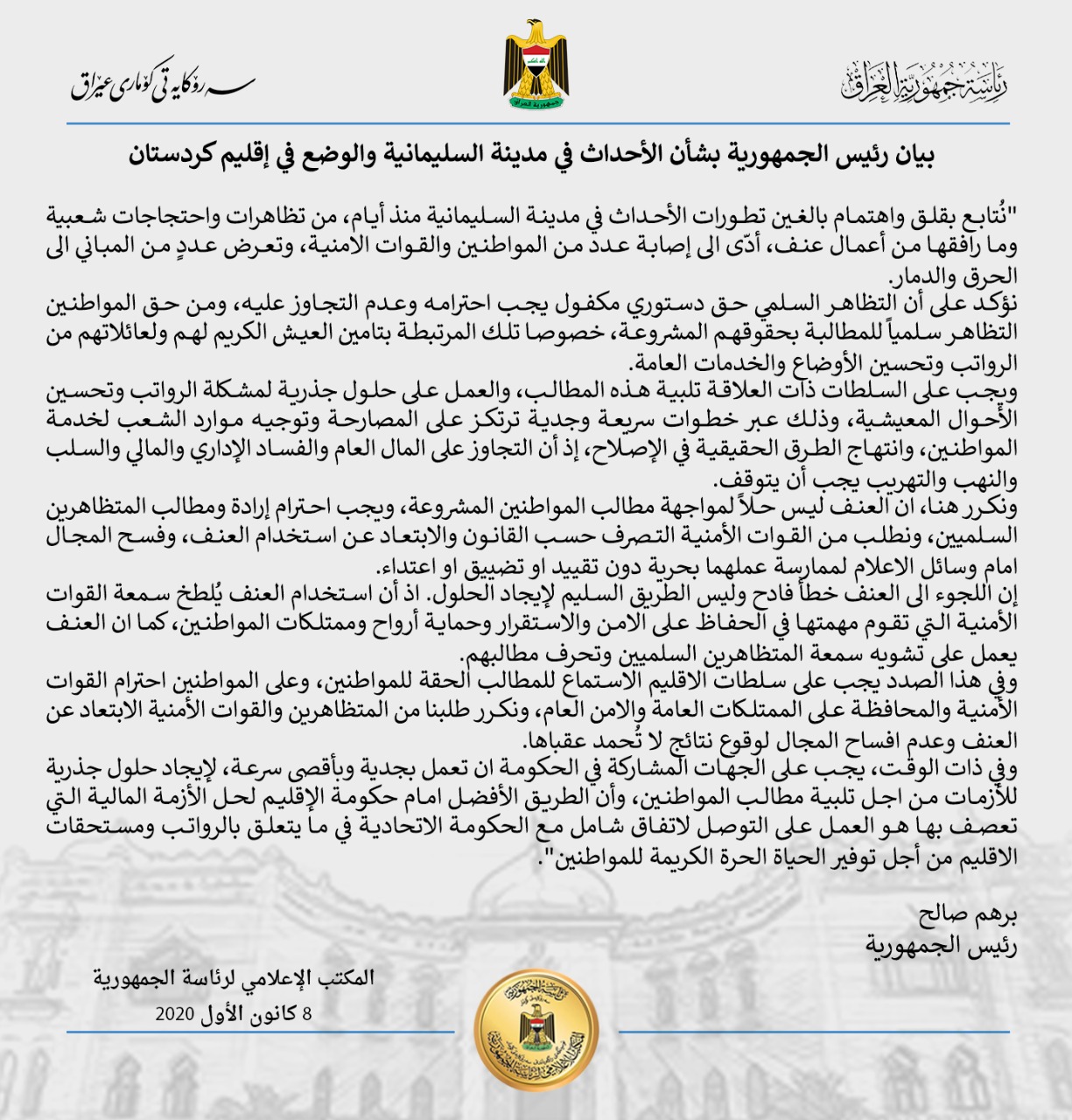 اصدر رئيس الجمهورية، برهم صالح، اليوم الثلاثاء، بياناً بشأن الأحداث في مدينة السليمانية والوضع بإقليم كردستان.