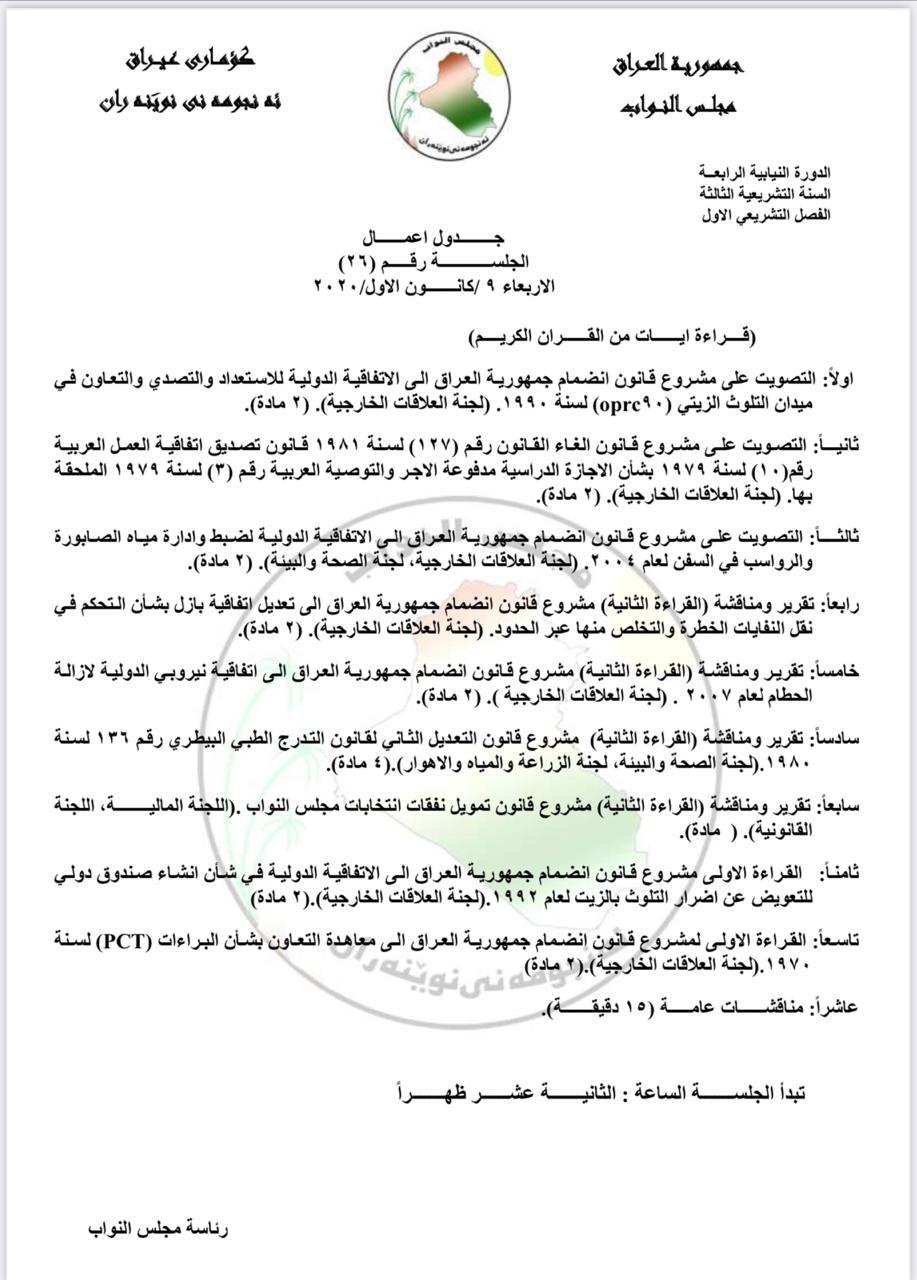 سياسةمجلس النواب ينشر جدول اعمال جلسة غد الاربعاء قبل 5 سنوات 3 مشاهدات شارك قد يهمك أيضا أمن عمليات بغداد تدعو للالتزام بالتعليمات والإجراءات المعتمدة باحتفالات رأس السنة قبل 33 دقيقة 8 مشاهدات أقتصاد السوداني: نسبة العجز المالي أثرت على مختلف القطاعات قبل 37 دقيقة 6 مشاهدات سياسة التحالف المسيحي يصدر بيانًا بعد خطاب لويس ساكو عن "التطبيع" قبل 55 دقيقة 11 مشاهدات محليات دائرة الطب العدلي تسلّم رفات 70 شهيداً من ضحايا مجزرة بادوش قبل ساعة واحدة 9 مشاهدات محليات الصحة توجه بالتحقيق في أسباب وفاة مريضة بأحدى المستشفيات الاهلية في بغداد قبل ساعتين 9 مشاهدات