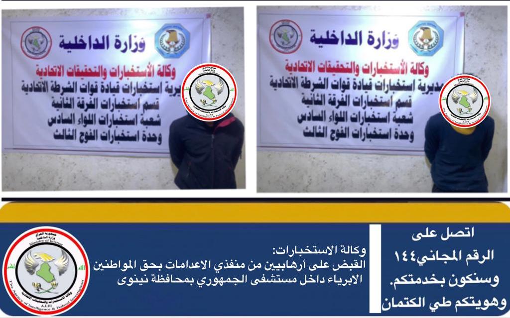 اعلنت وكالة الاستخبارات، اليوم الاحد، القبض على إرهابيين اثنين اعدموا مواطنين داخل مستشفى الجمهوري في نينوى.