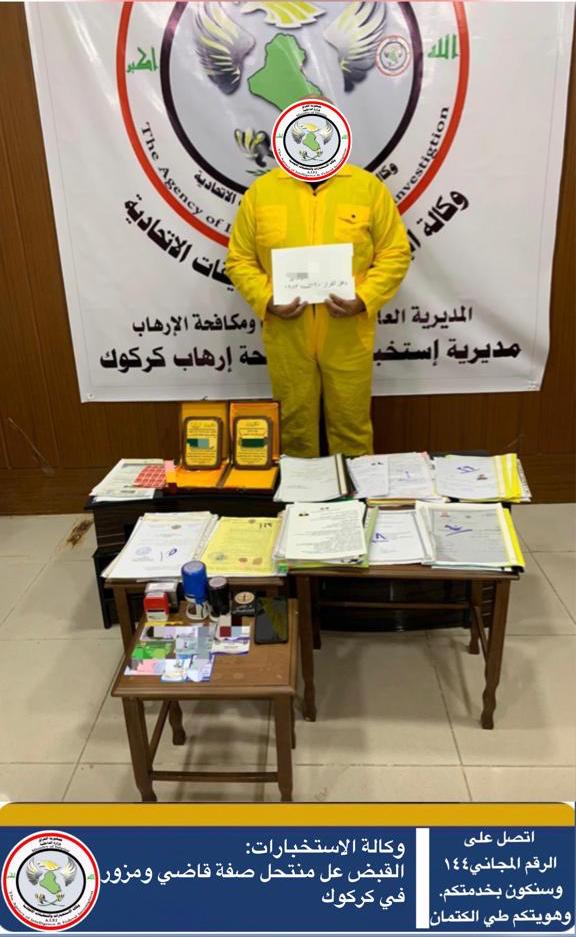 اعلنت وكالة الاستخبارات، اليوم الاحد، القبض على منتحل صفة قاضي ومزور في كركوك.