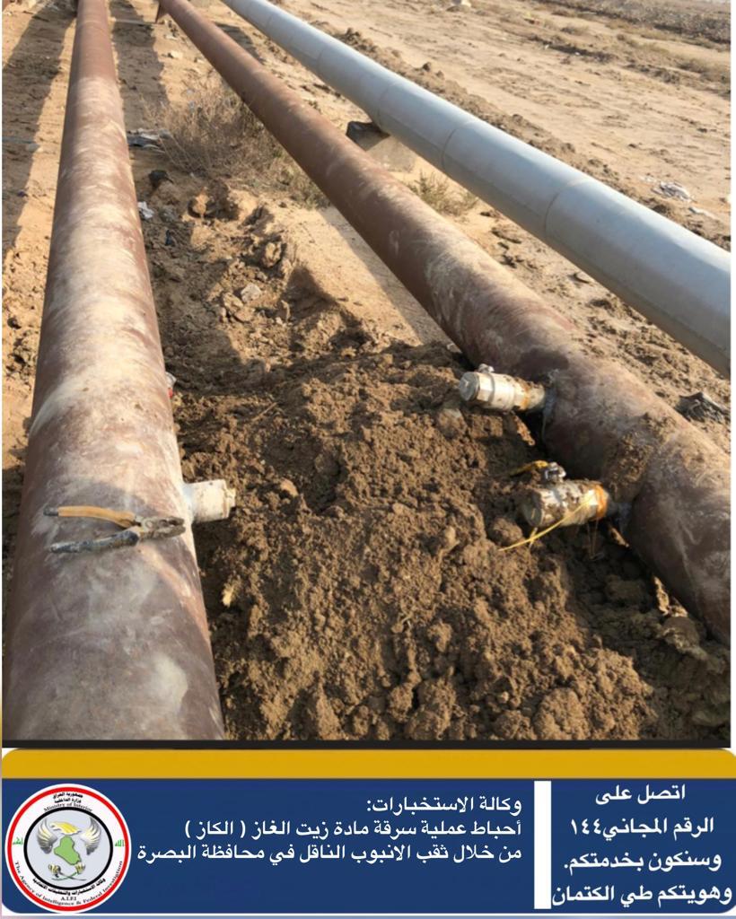 اعلنت وكالة الاستخبارات، اليوم الخميس، احباط عملية سرقة مادة زيت الغاز في البصرة.