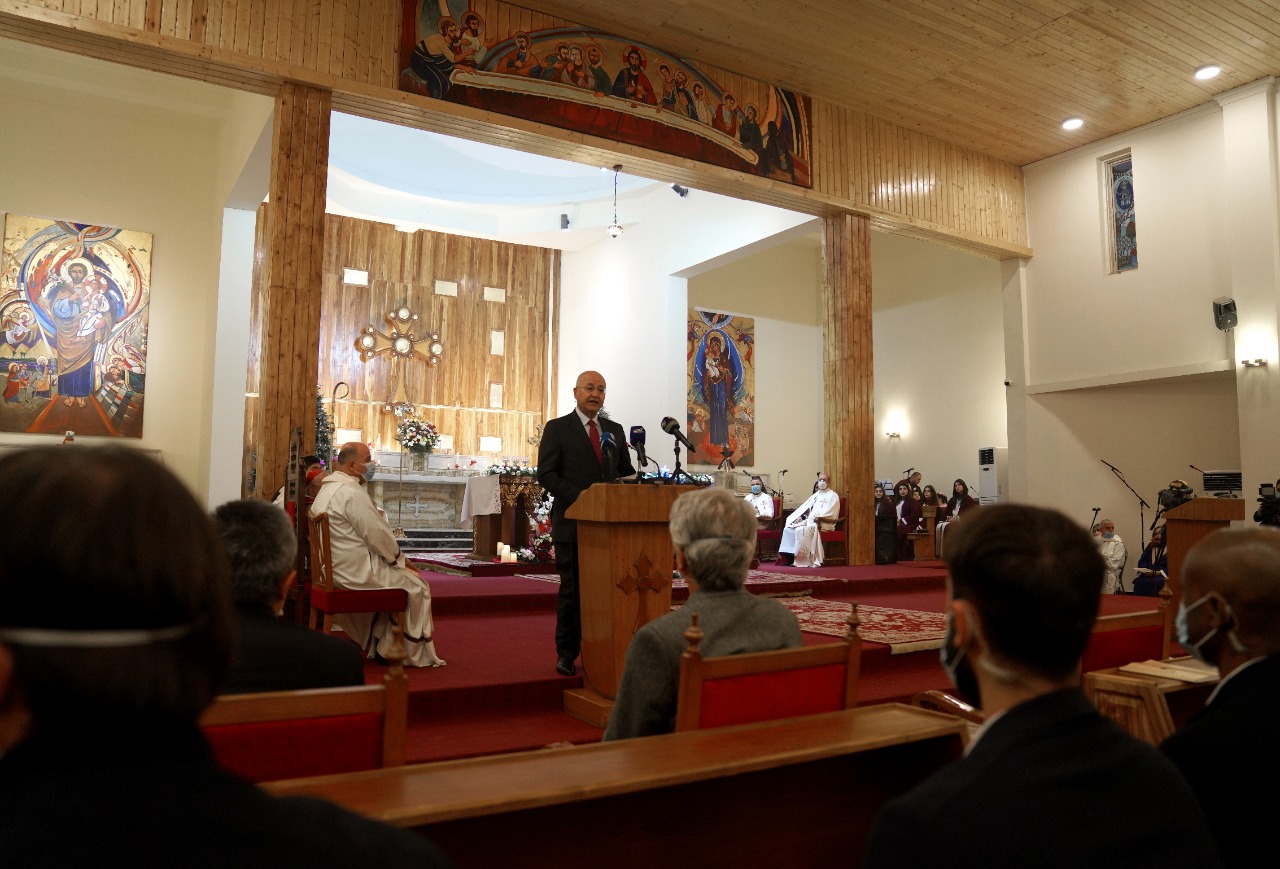 بروح الإنسانية والاخوّة والمواطنة، نبارك لأهلنا المسيحيين في العراق وفي العالم، بحلول أعياد الميلاد المجيد للسيد المسيح. أتشرف أن أكون في هذه الكنيسة كي نحتفل سوياً بهذه المناسبة المباركة وقد أقر مجلس النواب العراقي اعتماد عید میلاد السید المسیح عطلة رسمية للبلاد.