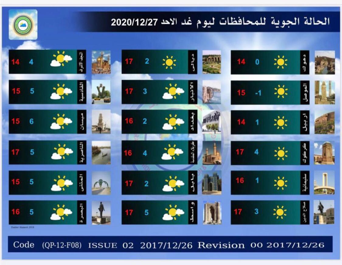 محلياتالحالة الجوية ودرجات الحرارة في العراق اليوم السبت والايام المقبلة قبل 5 سنوات 6 مشاهدات شارك الطقس قد يهمك أيضا سياسة العراق وباكستان يناقشان الارتقاء بواقع التبادل التجاري والسجناء والعمالة قبل ساعتين 8 مشاهدات مع ياسر عامر الفصائل تنزع سلاحها و”النجباء والكتائب” يرفضون!! قبل 3 ساعات 7 مشاهدات سياسة المجلس السياسي الوطني يقرر عقد اجتماع الثلاثاء المقبل لمواصلة النقاشات قبل 3 ساعات 13 مشاهدات سياسة المجلس السياسي الوطني يؤكد الالتزام بالتوقيتات الدستورية لجلسة البرلمان قبل 3 ساعات 12 مشاهدات عربي ودولي السويد.. حادثة تدنيس جديدة للمصحف في مسجد ستوكهولم تؤجج مشاعر المسلمين قبل 4 ساعات 8 مشاهدات