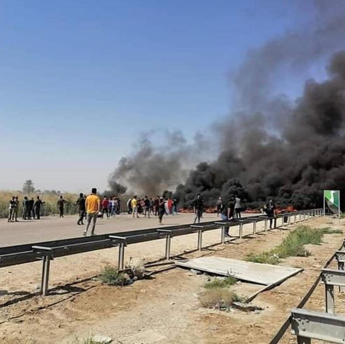 متظاهرون يحرقون الاطارات ويقطعون الطريق السريع الدولي في محافظة بابل