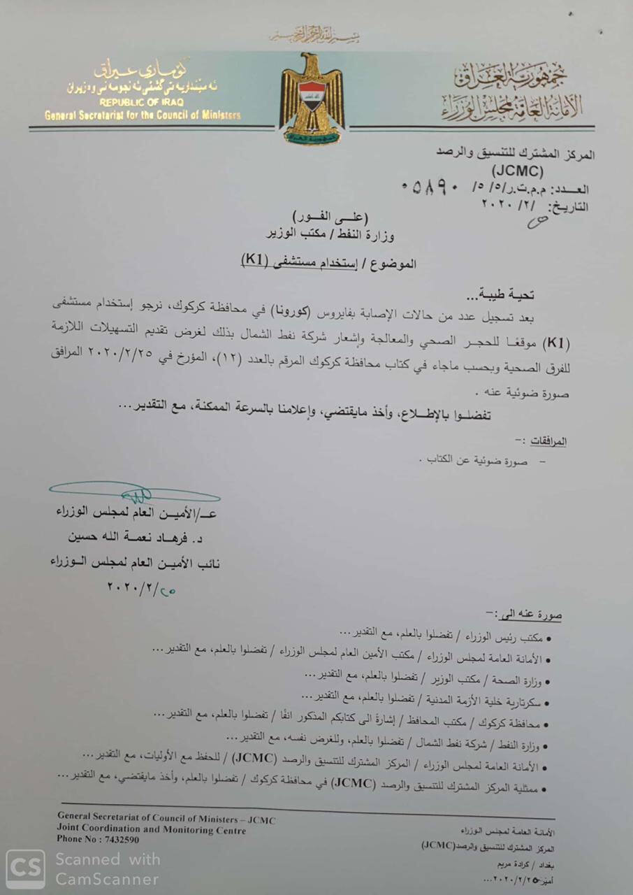بالوثيقة .. امانة مجلس الوزراء تخاطب وزارة النفط لاستخدام مستشفى كي وان بكركوك موقعاً للحجر الصحي