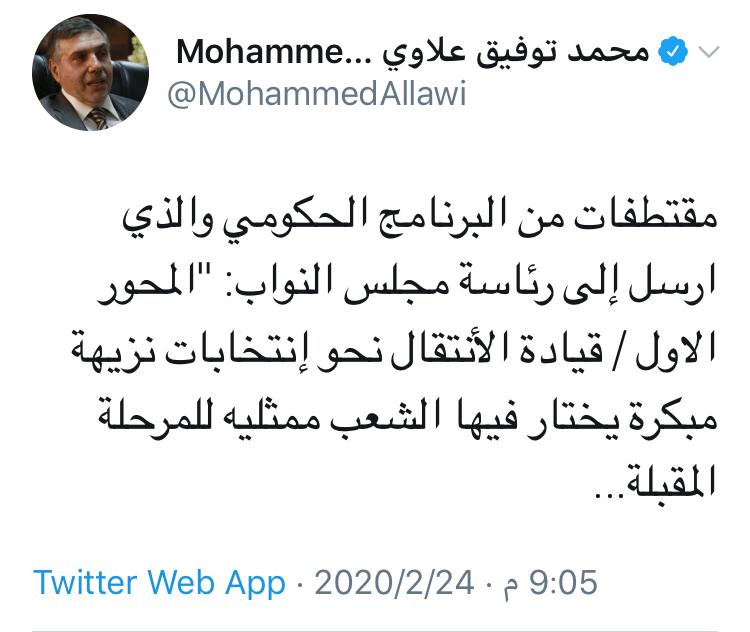 محمد علاوي: قيادة الأنتقال نحو إنتخابات نزيهة مبكرة المحور الاول في البرنامج الحكومي