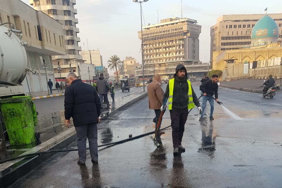 بالصور .. امانة بغداد تباشر بتنظيف الطريق بين الخلاني وتقاطع الحضرة القادرية بعد اعادة فتحه