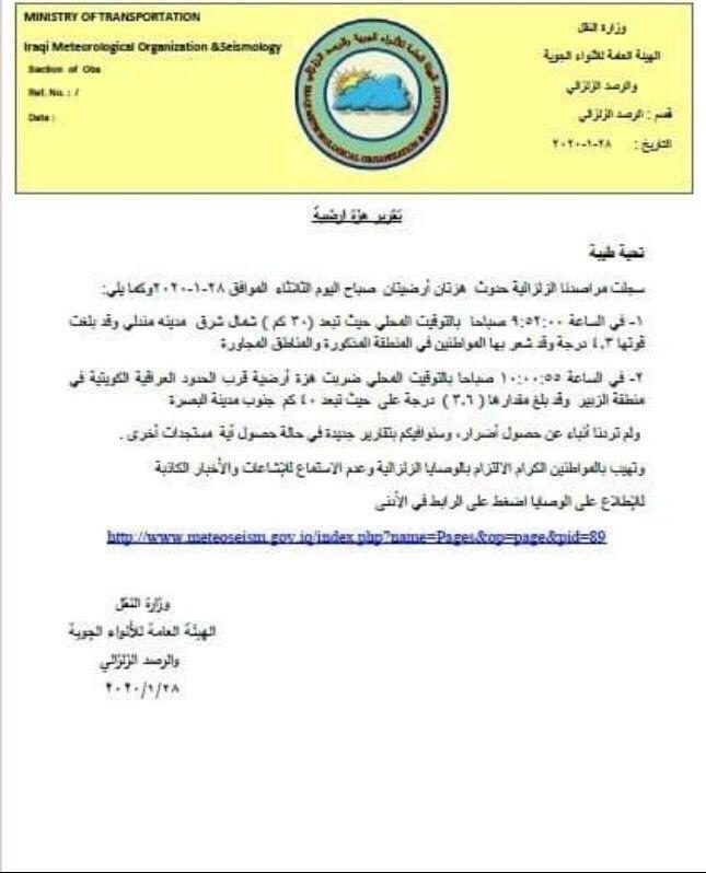 الرصد الزلزالي يعلن تسجيل هزتين ارضيتين شمال شرق مندلي وعلى الحدود مع الكويت