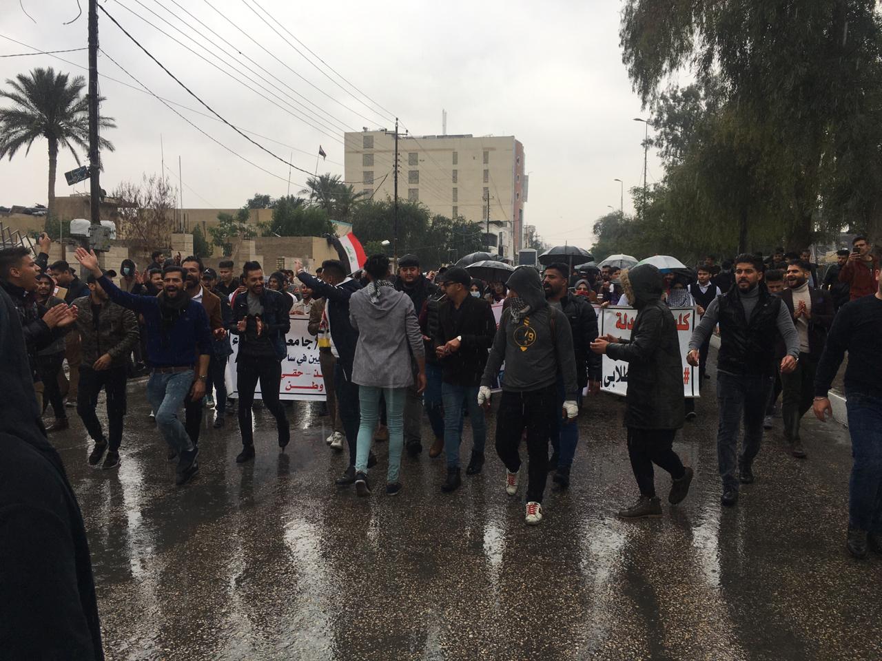 بالفيديو .. طلبة الجامعات والمدارس في كربلاء يتظاهرون رغم غزارة الامطار