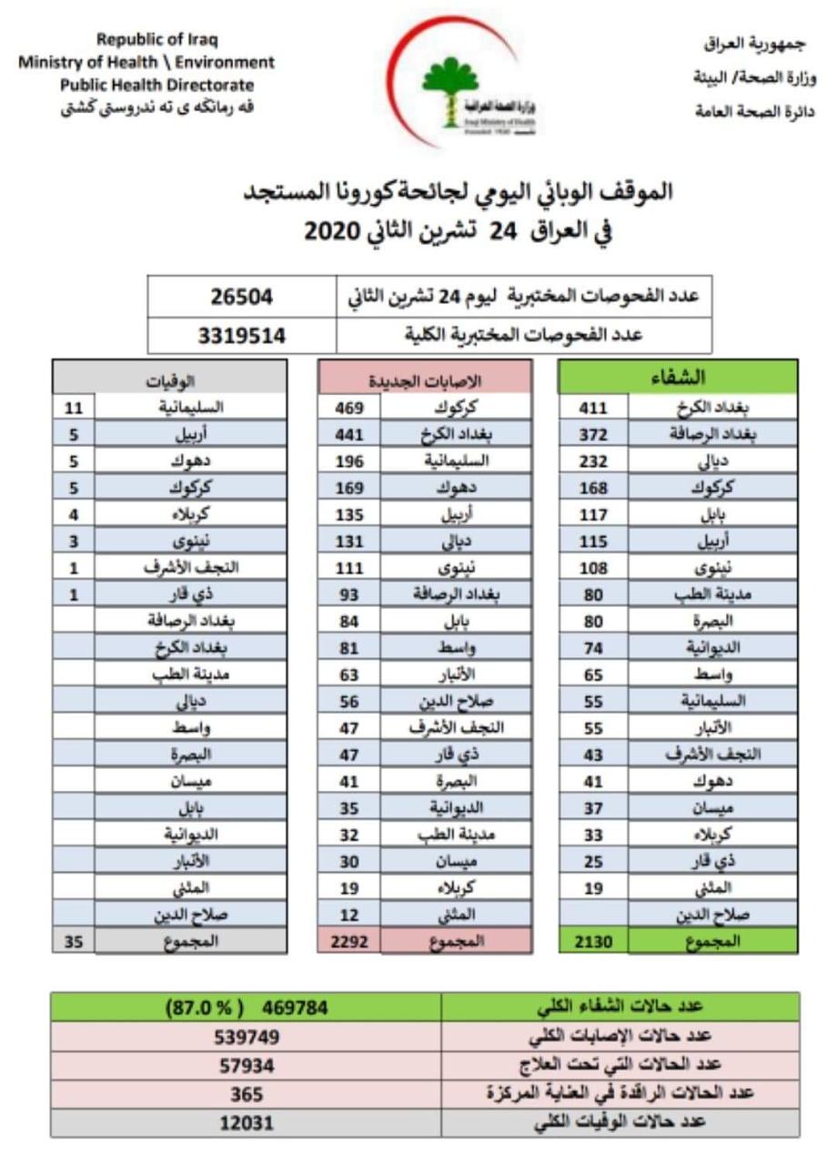 الصحة تعلن تسجيل 2292 اصابة جديدة بفيروس كورونا في عموم العراق