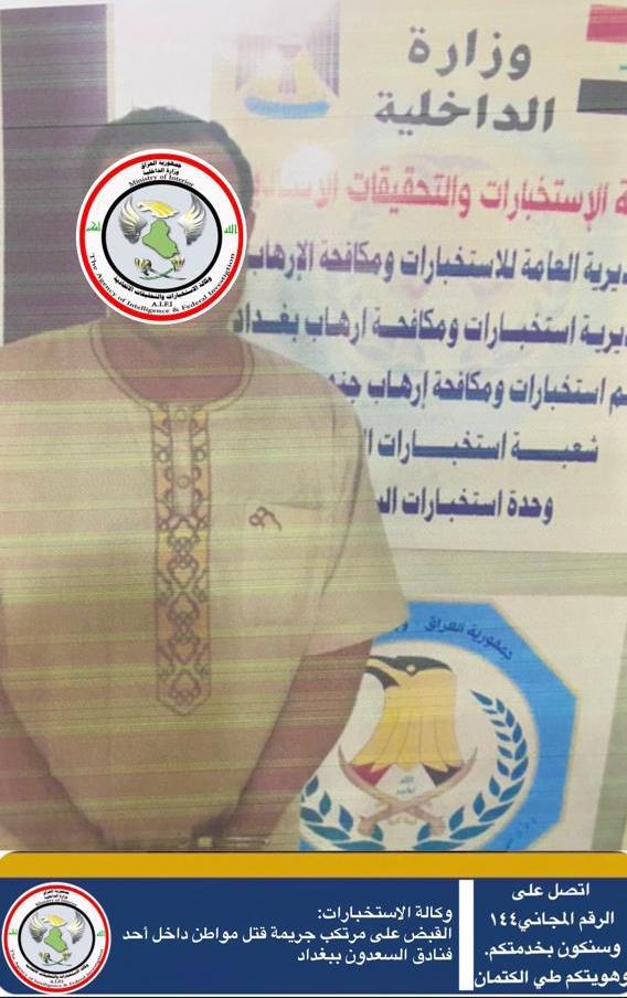 وكالة الاستخبارات: القبض على مرتكب جريمة قتل مواطن داخل أحد فنادق السعدون ببغداد