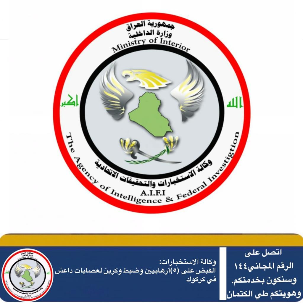وكالة الاستخبارات تعلن القبض على 5 ارهابيين وضبط وكرين لداعش في كركوك