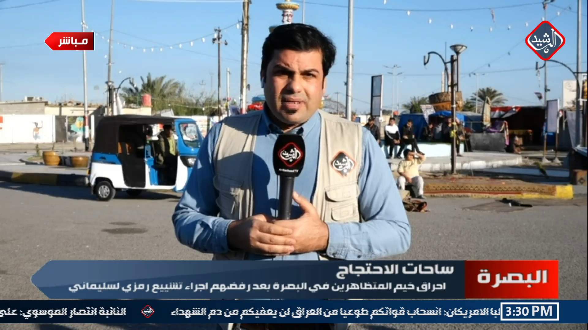 احراق خيم المتظاهرين في البصرة بعد رفضهم اجراء تشييع رمزي لسليماني علي عدنان / مراسلنا من البصرة
