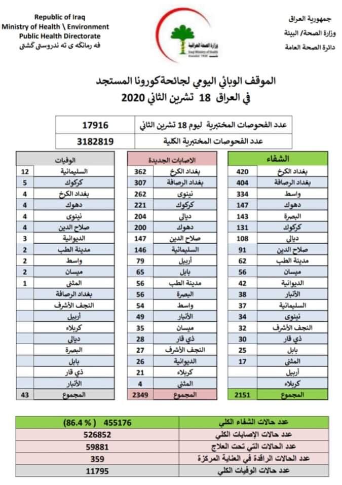 الصحة تعلن تسجيل 2349 اصابة جديدة بفيروس كورونا في عموم العراق