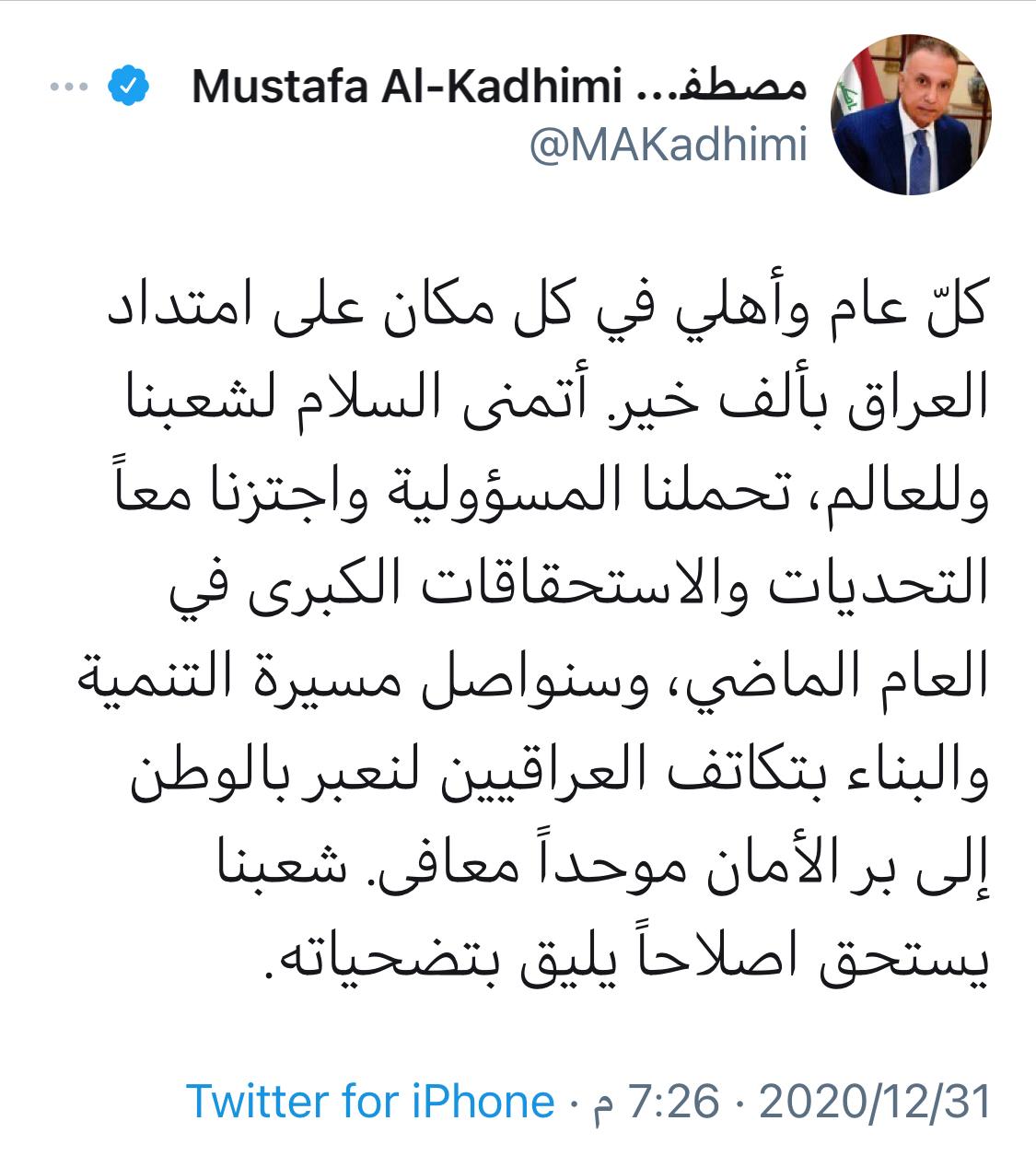 الكاظمي: تحملنا المسؤولية واجتزنا معاً التحديات والاستحقاقات الكبرى في العام الماضي