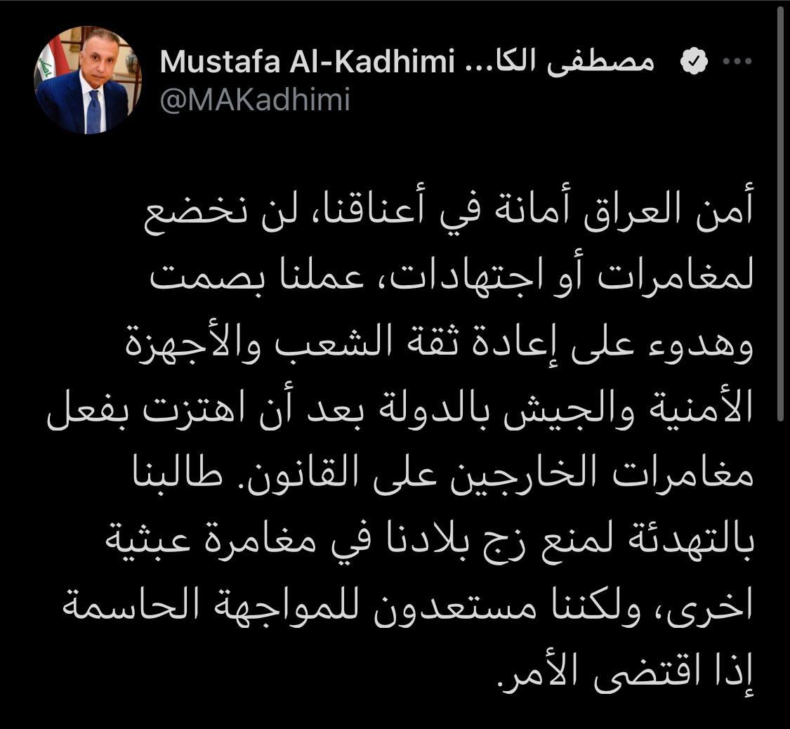 الكاظمي: أمن العراق أمانة في أعناقنا لن نخضع لمغامرات أو اجتهادات