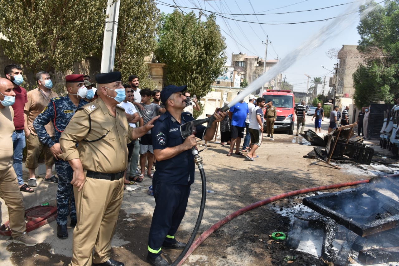 بالصور .. الدفاع المدني ينقذ عائلة ويخمد حريقاً في ثلاث مولدات كهربائية بمنطقة الكرادة