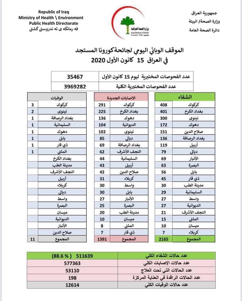 الصحة تعلن تسجيل 1391 اصابة جديدة بفيروس كورونا في عموم العراق