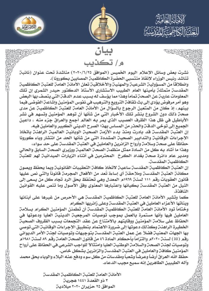 العتبة الكاظمية تنفي اصابة منتسبيها بفيروس كورونا