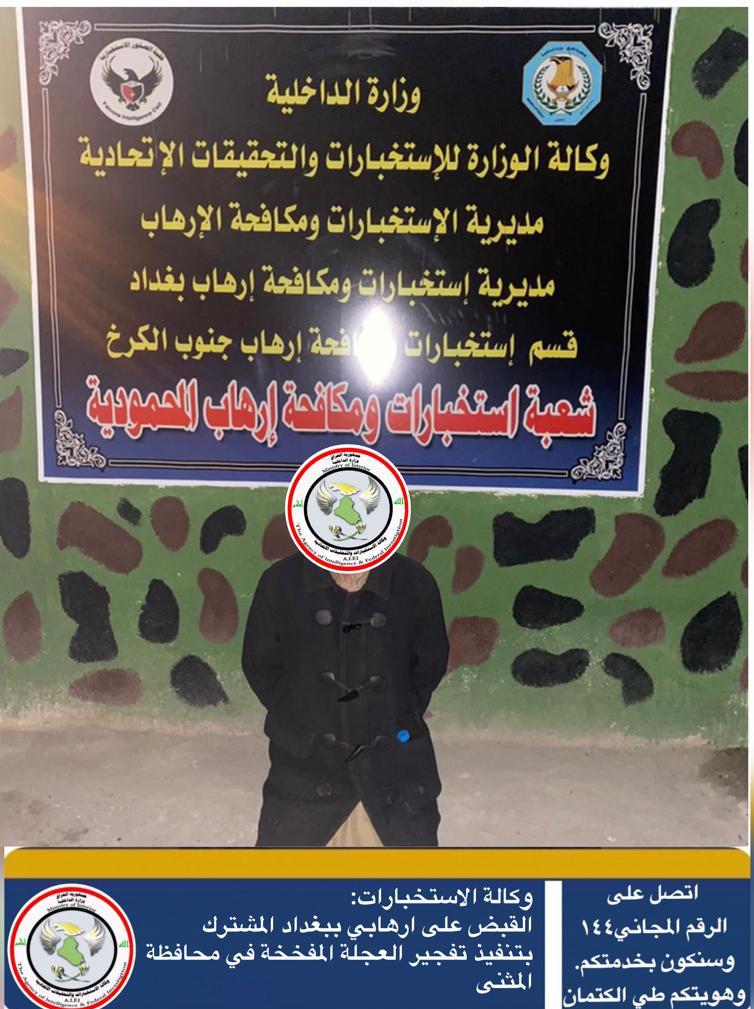 وقالت الوكالة، في بيان تلقته الرشيد، انه “في مطلع العام ٢٠١٦ انفجرت عجلة مفخخة في محافظة المثنى راح ضحيها اكثر من ثلاثين شهيداً، وبعد تكثيف الجهد الاستخباري بين مديريات وكالة الاستخبارات في محافظتي بغداد والمثنى تمكنت مفارز شعبة استخبارات المحمودية التابعة لمديرية استخبارات بغداد في وزارة الداخلية من القاء القبض على احد منفذي تلك الجريمة النكراء في منطقة اللطيفية جنوبي العاصمة”.